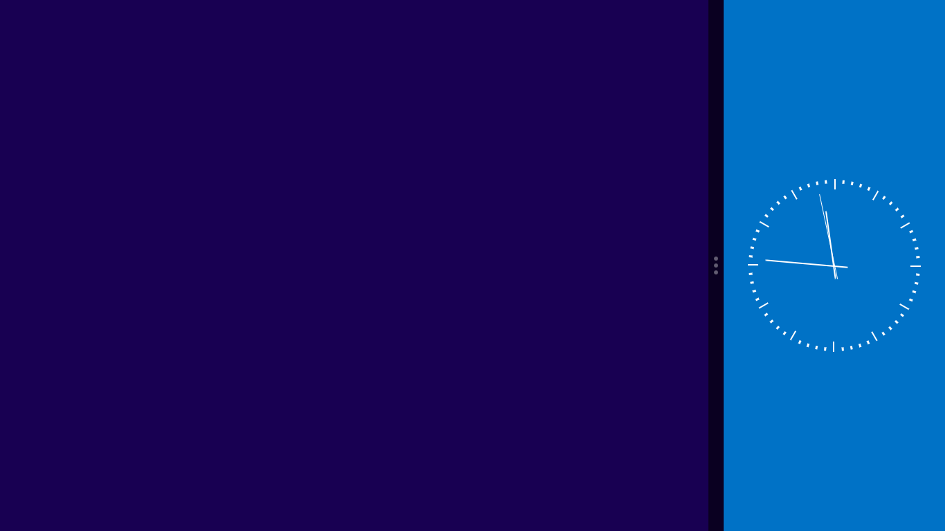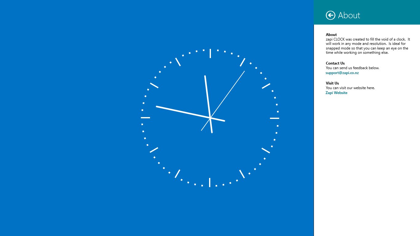 This is an analog clock that can be used in any mode and resolution. Ideal for using in snapped mode so that you can keep an eye on the time while working on something else.