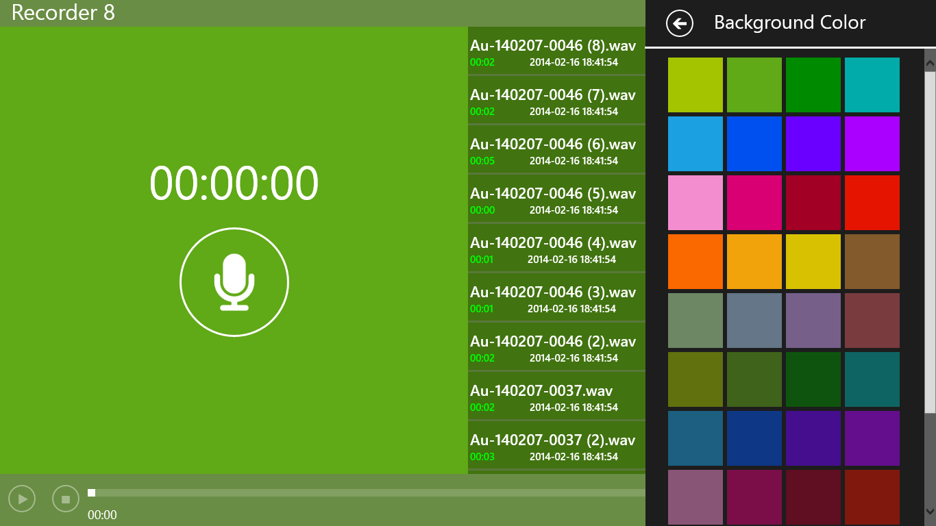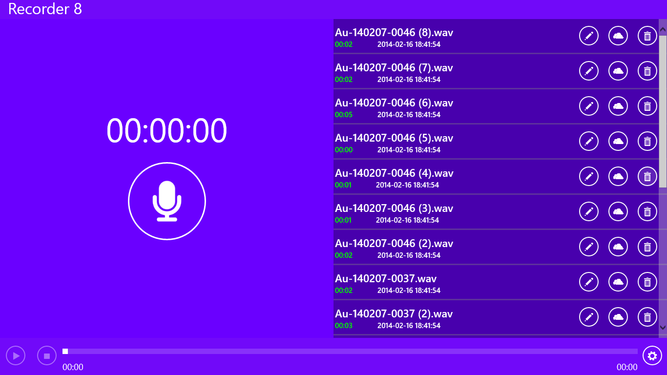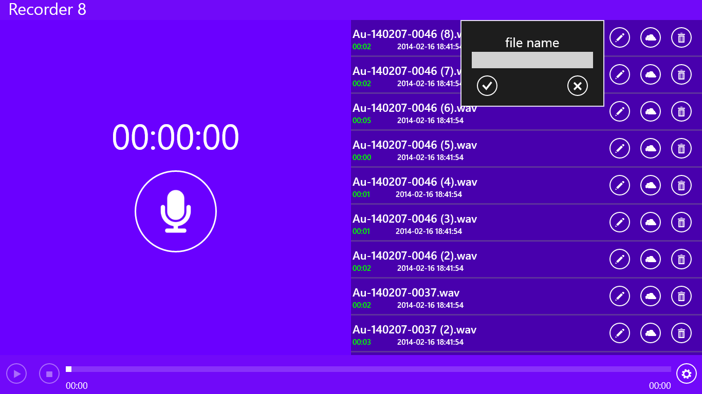 Record audio fileHigh-quality recordupload recording to SkyDrive(OneDrive)Manage recording files(change file name or delete file)Smart UI, convenient and beautifulBackground color changeableWallpaper changeableLong time recordPin audio file to start screen