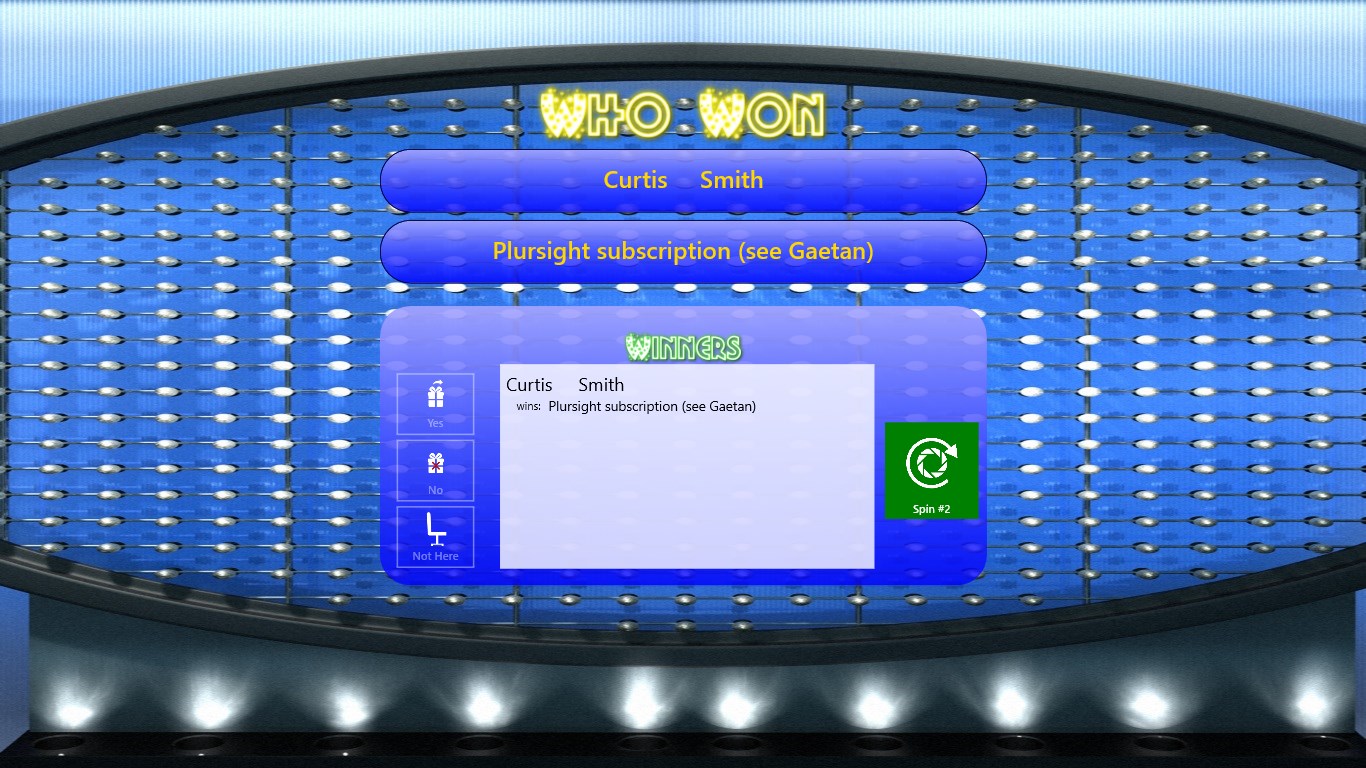 Not Here => Attendee not present, removes Attendee from draw, leaves Prize in draw to be given to another Attendee.
