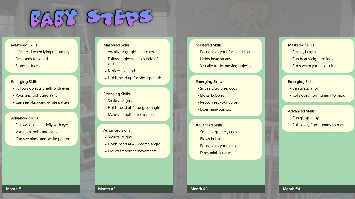 Clearly marked out, each month contains Expected, Emerging and Advanced baby development milestones so you can easily tell where your child is developmentally.