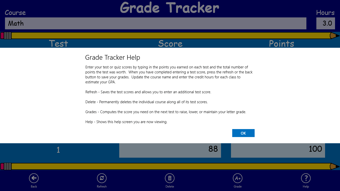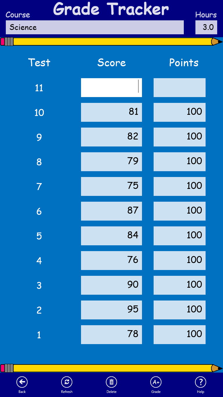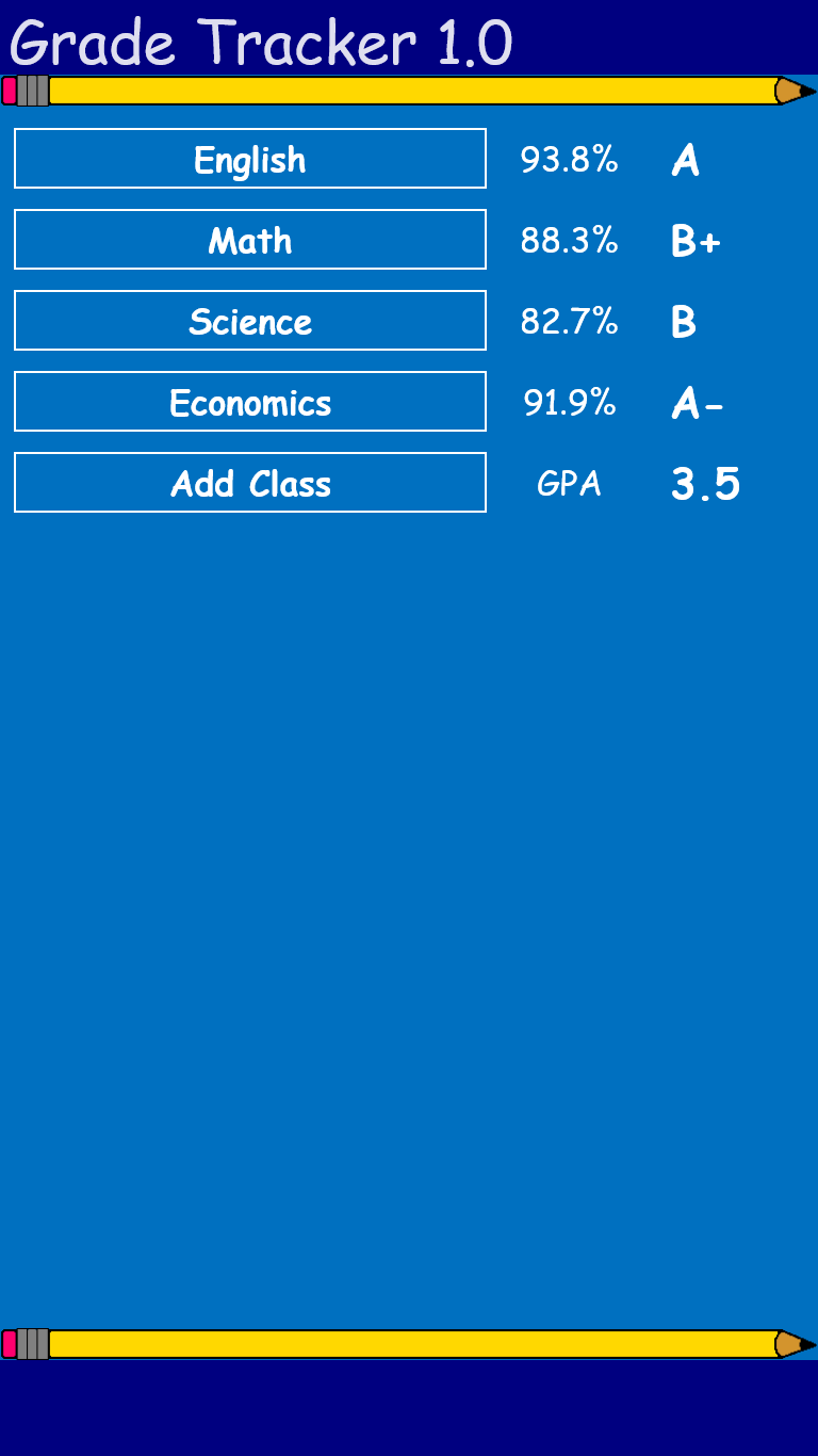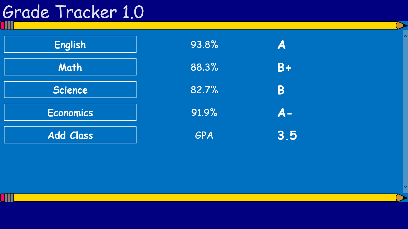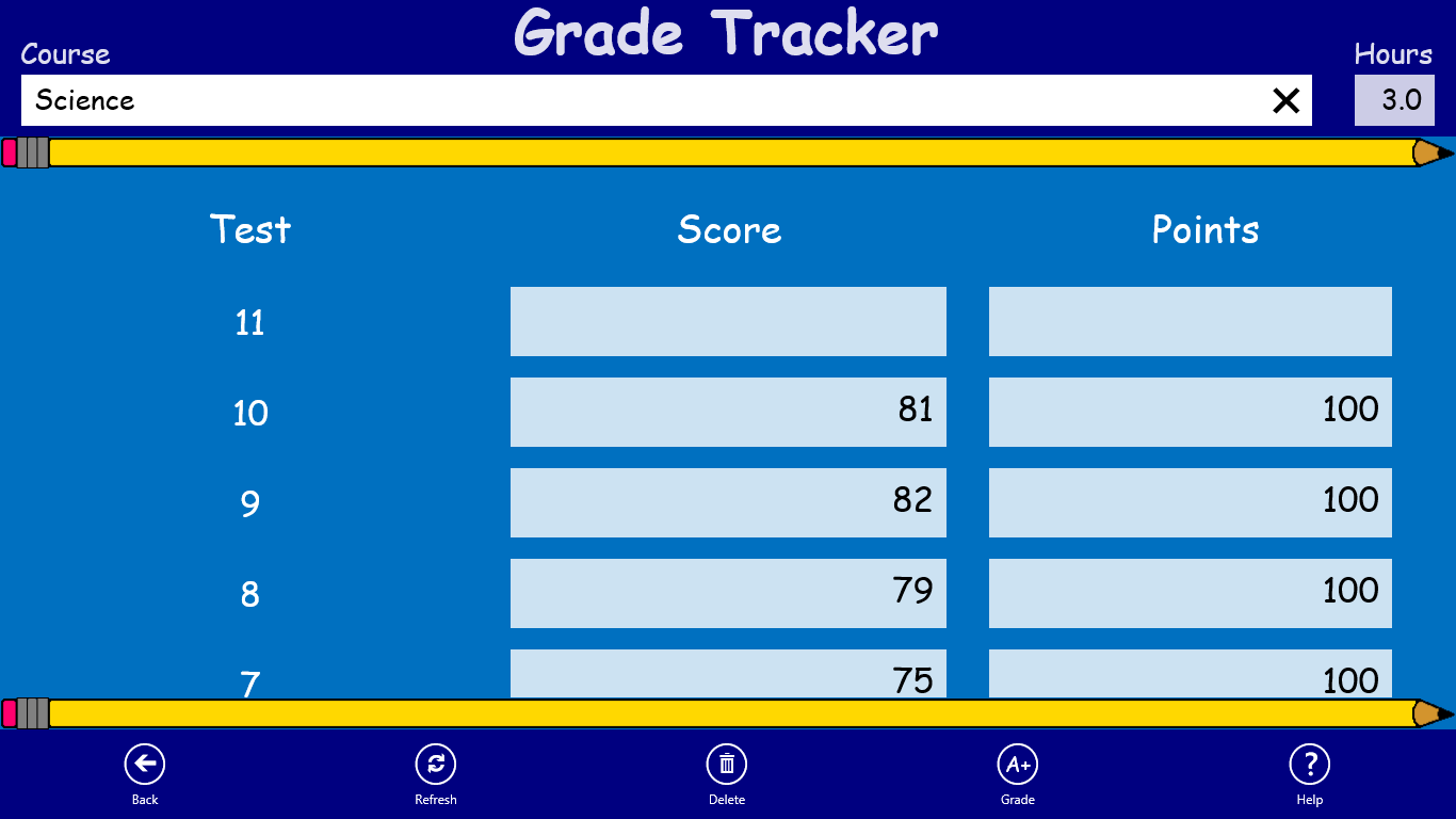 Every student wants to make good grades and graduate with honors. Each semester your course work provides opportunities to excel and offers tough challenging studies. Although your teacher or professor ultimately determines your final grade, one way to avoid surprises at the end of the semester is to keep track of your grades for each class. Grade Tracker stores the scores for each test or quiz for each class so you know your position going into the final exam.