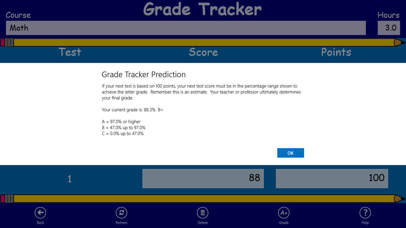 Knowing your grade in each class can help you efficiently direct your study time. Are you prepared for the next test? Just press the A+ button to see what score you need on the next test to raise your letter grade or keep the letter grade you have earned. Be smart and download the Grade Tracker app. Discover how easy it is to track your grades in each class.