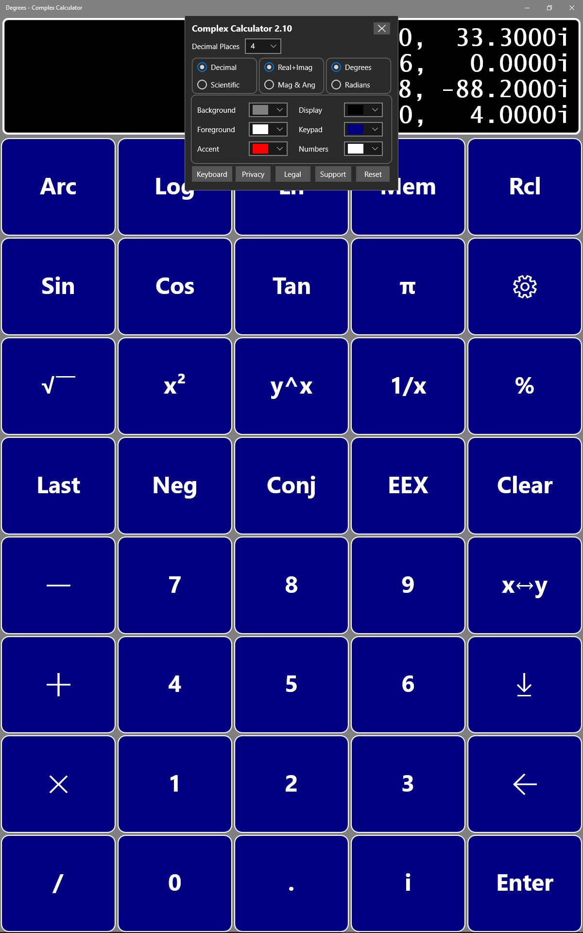 Privacy Statement: Data entered into Complex Calculator is used solely for the purpose of performing calculations. This data is saved in the user's application local storage on the system and not shared, collected, or stored elsewhere. This data is not used to identify or contact you. If email is used for support purposes, your email address may be used for the sole purpose of responding to the support email inquiry.