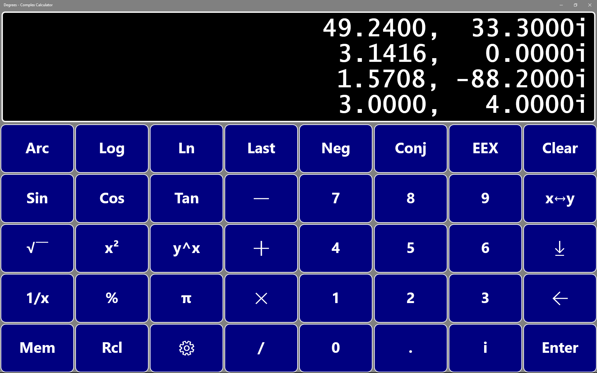 “Complex Calculator” is a simple to use calculator that makes real and complex math calculations easy. It was designed by an engineer from the start specifically to handle complex math. The calculator handles purely real math calculations effortlessly too. This calculator operates using post-fix or RPN notation.