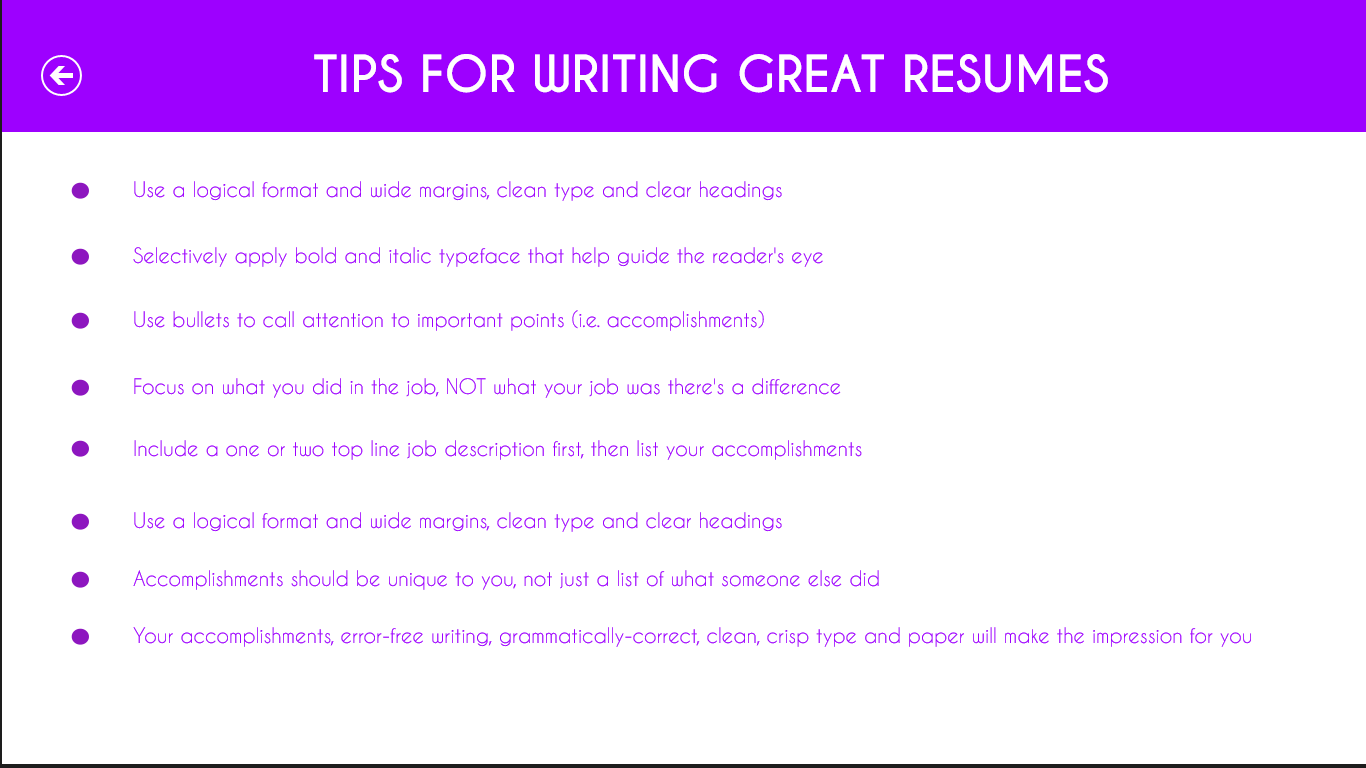 Here is the "QUICK RESUME" to help you. With this application you can design your resumes in more or less a minute. With the built-in great professional templates, all you need to do is put your content on the template and save it as a file. To make your own resume,the app includes great tips for writing it.