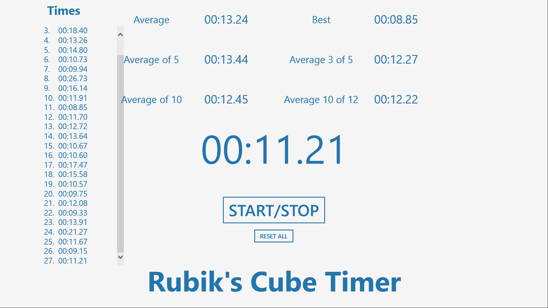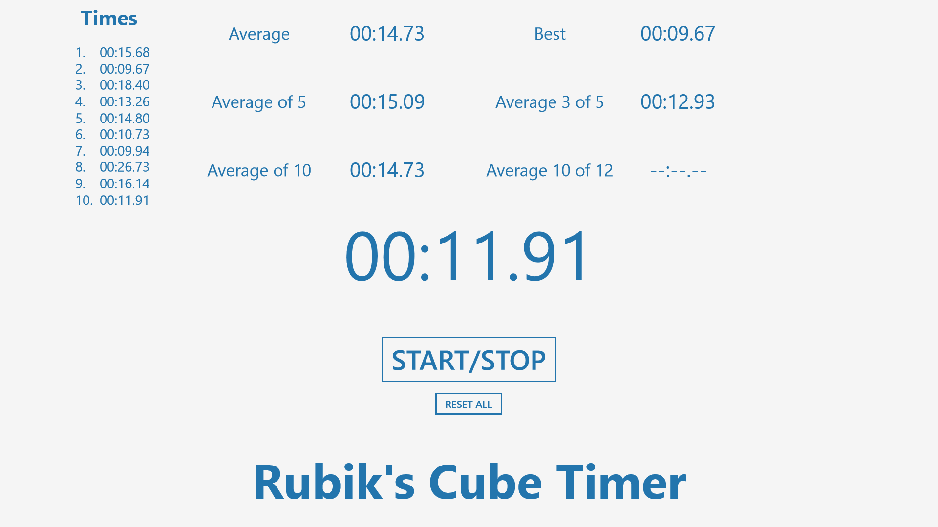 See how much of a speedcuber you are! With this application, you can easily time all of your cube solvings. Hold the Space Bar and release it whenever you're ready to launch the timer. Simply press the Space Bar again to stop it. This tool keeps a track of all your times and display them. It also shows you your: