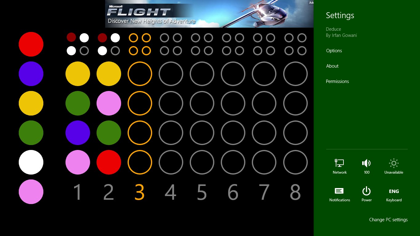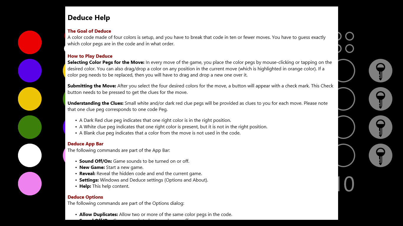 Use logic and deduction to break the computer-generated 4-color code in ten or fewer moves. You have to guess exactly which color pegs are in the code and in what order. Deduce is an analog of the well-known award-winning game "MasterMind".