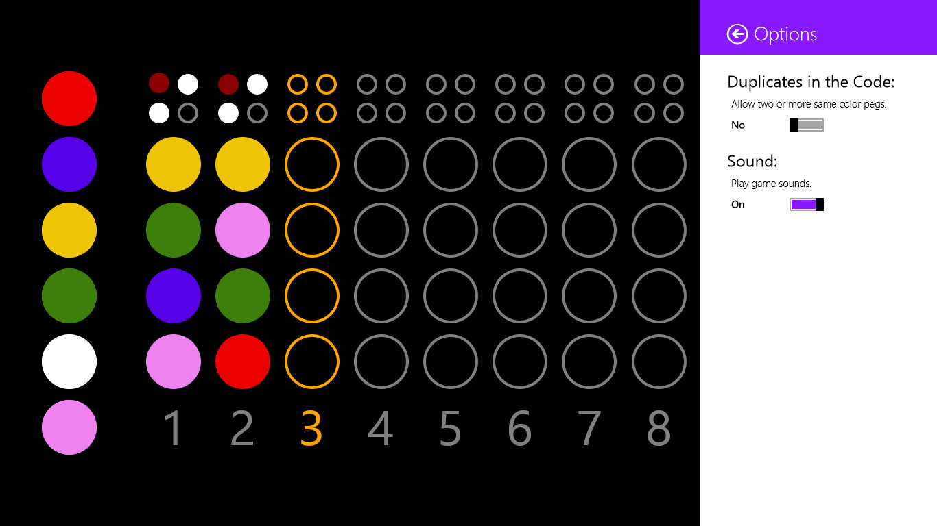 Touch/Tap EnabledDrag and DropSound and MusicAllow/Disallow duplicates in the color codeSound Off/OnReveal the hidden code and end the current gameSettings and OptionsDetailed Help
