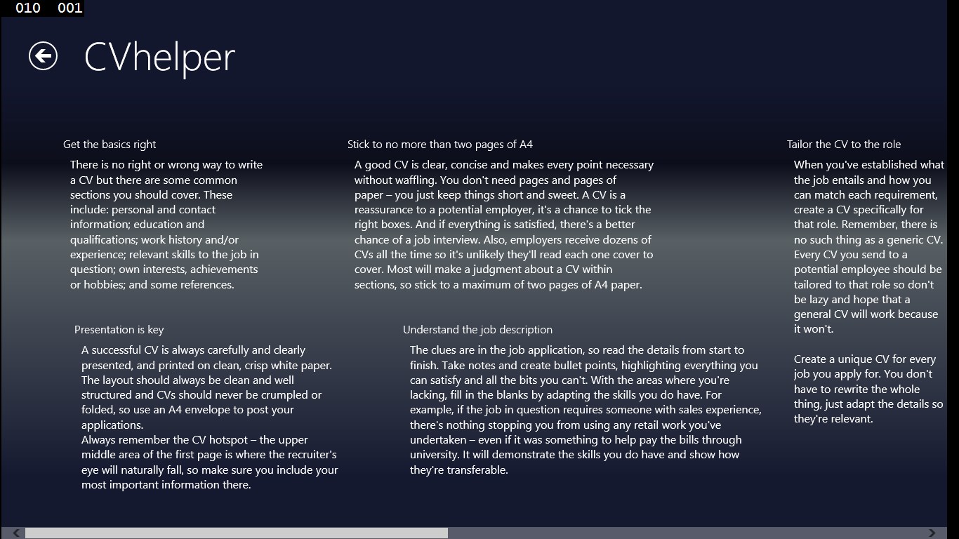 CVhelper is a Windows store application meant to help you organise and keep updated all your qualifications so that you will be able to compose fast end efficiently your CV when needed. CVhelper will also provide you with some useful tips and guidelines so that your CV become as great as possible. Finally, it can also save you time by taking you to the most common CV templates online.