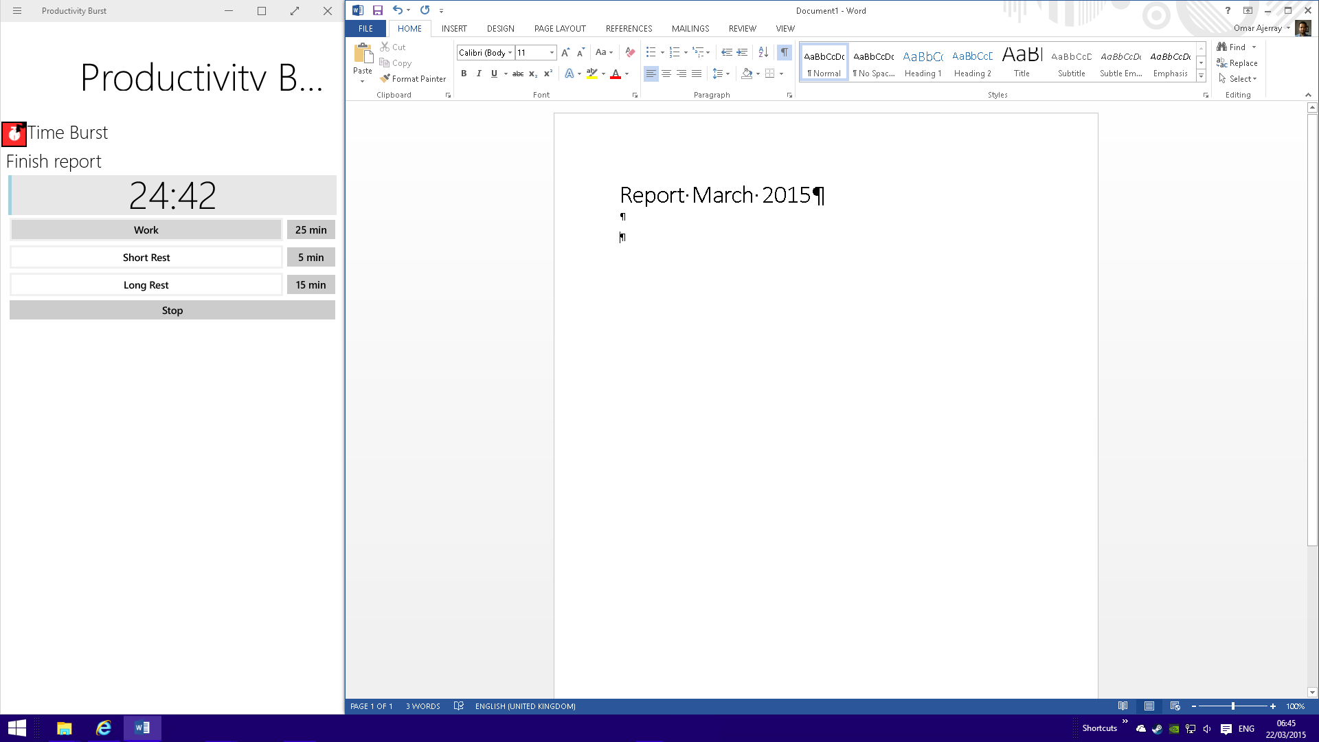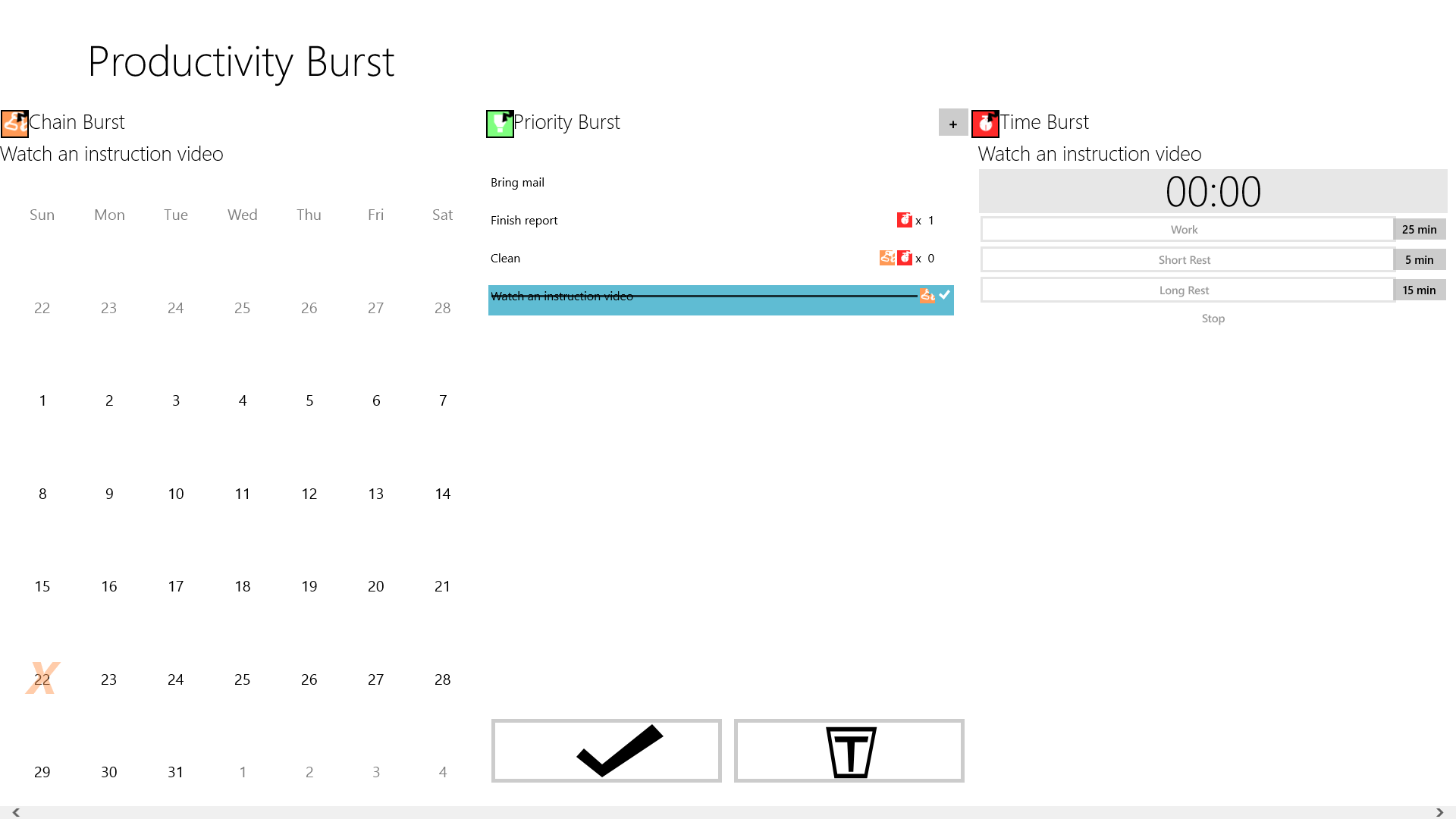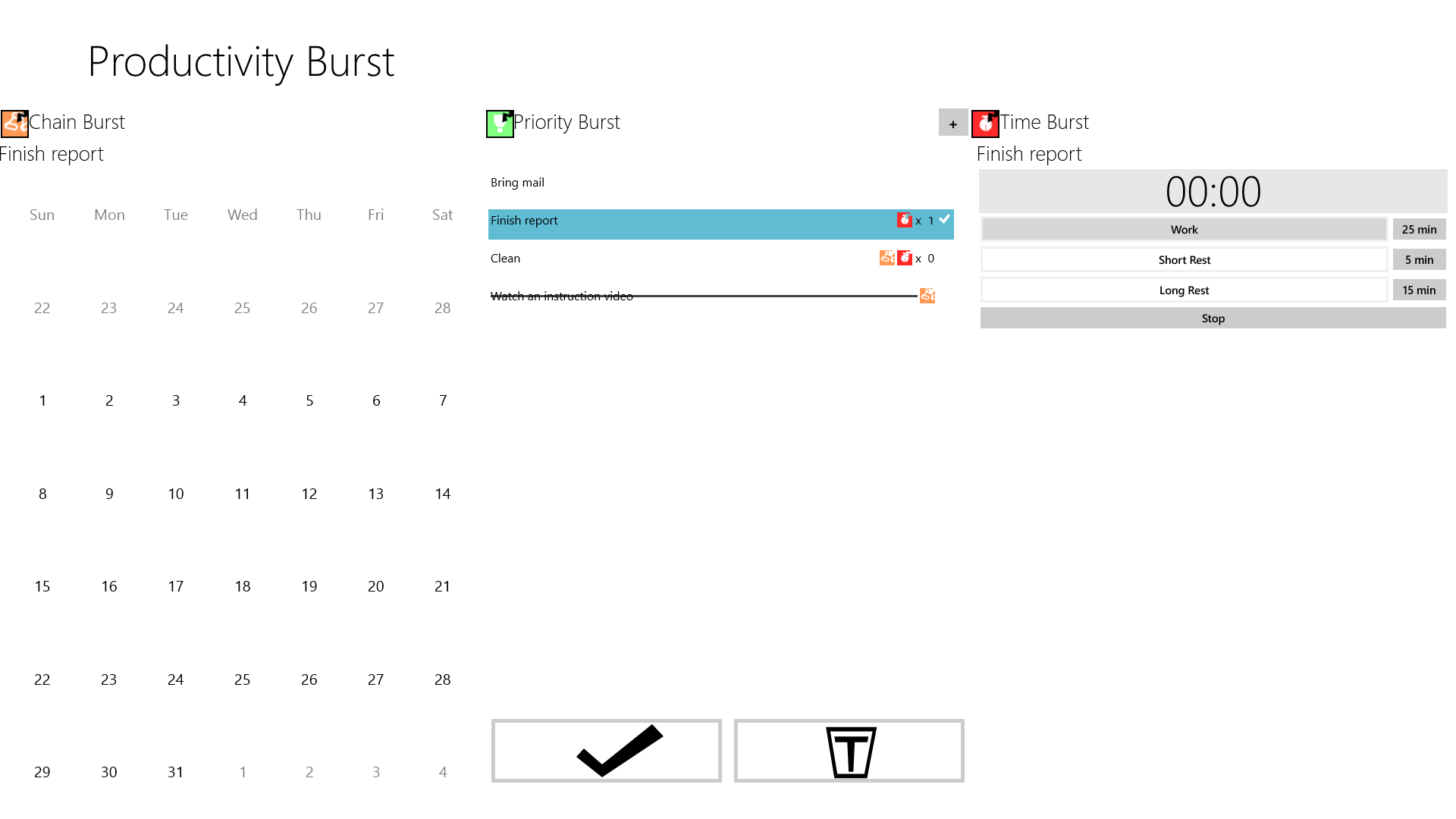 Productivity Burst is an App which allows the user to use certain popular productivity techniques but without all the tedious writing and note making, instead utilizing the possibilities of modern technology.