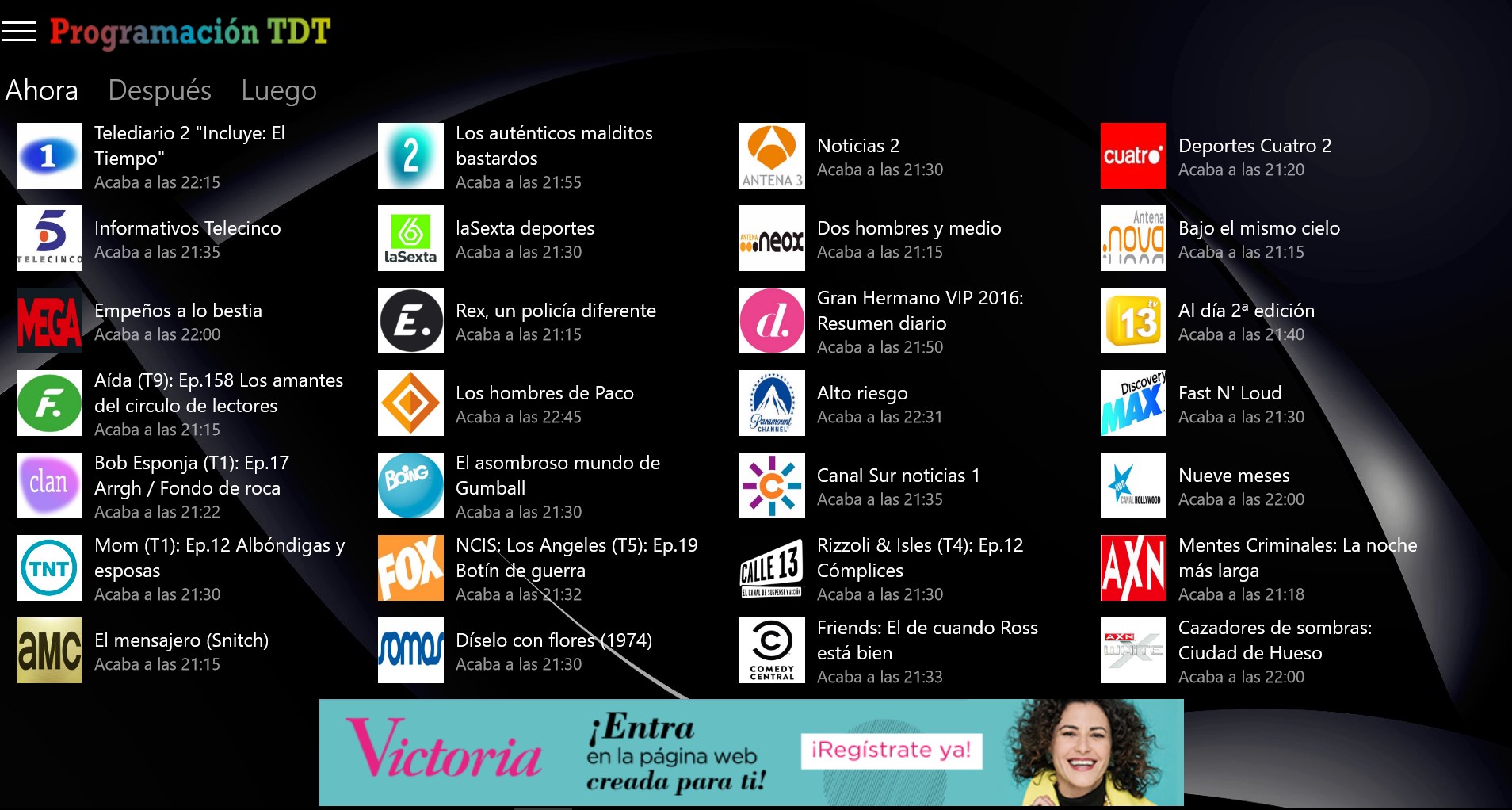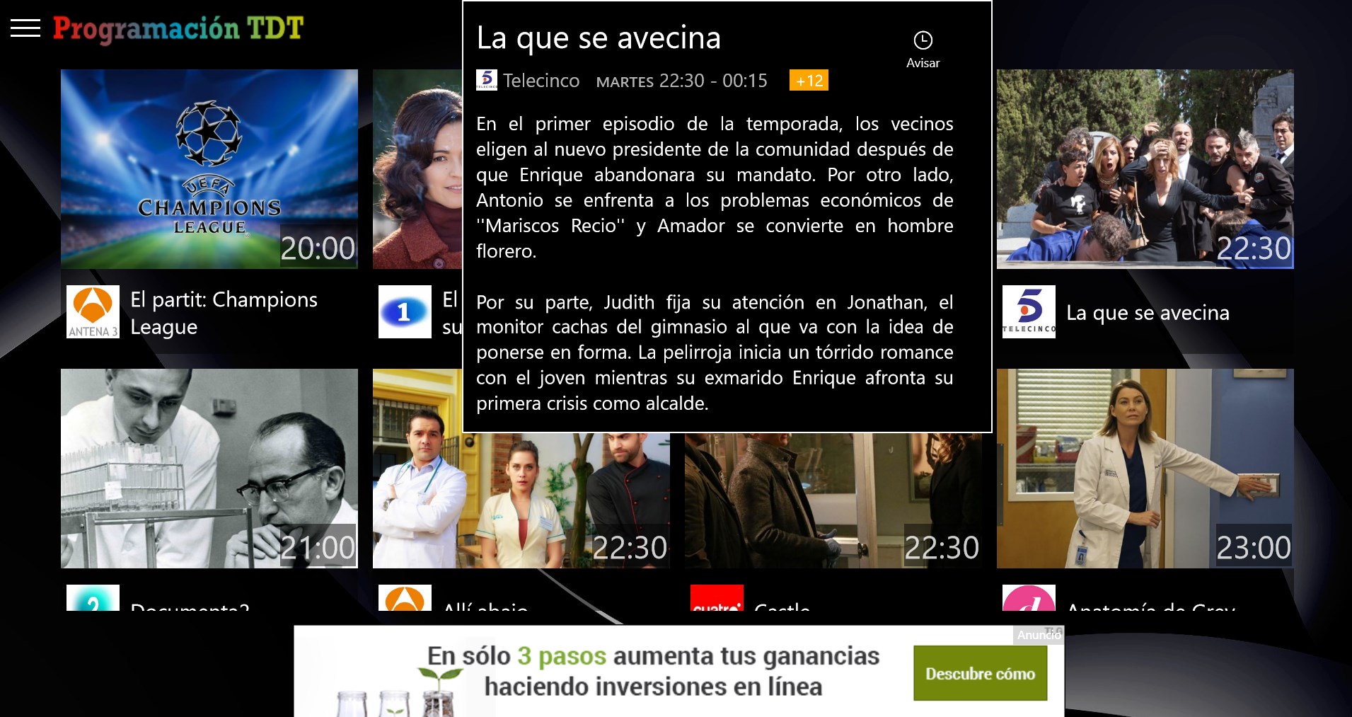 Información detallada y en tiempo real sobre una amplia variedad de canalesNotificaciones cuando empiecen los programas que quieras verEl Live Tile se actualiza para mostrar los más destacados del día