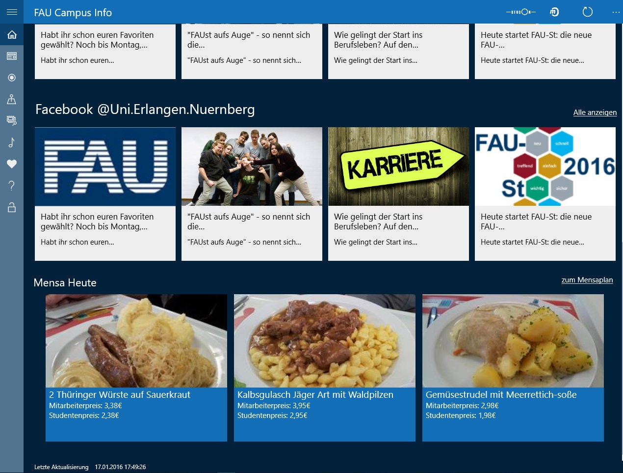 FAU NewsFeedMensaplan mit BildernOffline RaumsucheLive KachelWeb BuchfinderSchnell Links zu Studon und meinCampusUni Radio BetaStartseite mit allen wichtigen Informationen