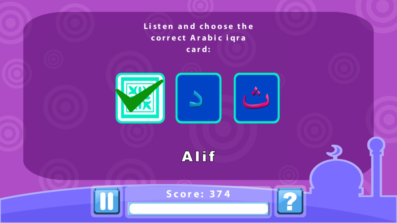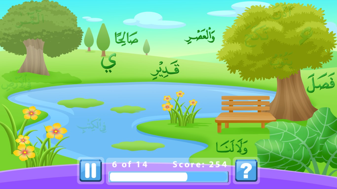 Good graphics, animation, speech, music and sounds.Varied lesson pack.Arabic and transliteration.Levels, stages, and unlimited challenges.High scores.