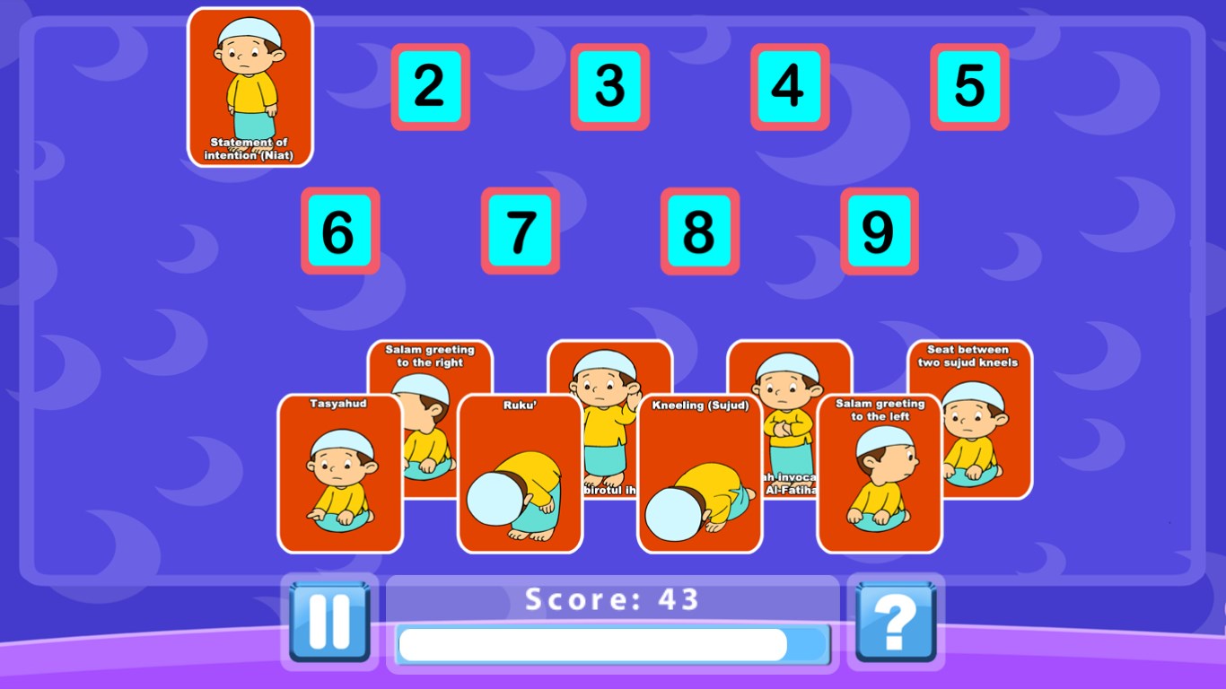 Muslim Kid Games is an educational game pack that helps you or your children to know salat times, wudhu, salat movements, iqra (lessons that help to learn to read Al-Qur'an), Arabic alphabets, and numbers using some fun gaming approaches: