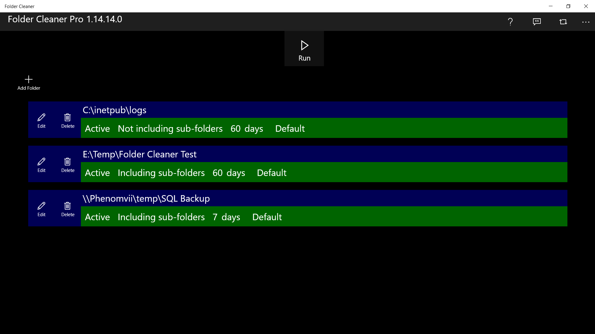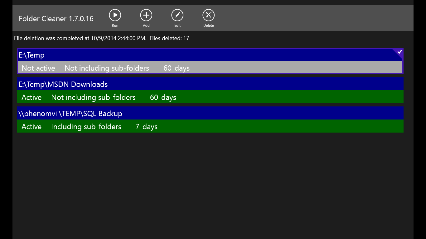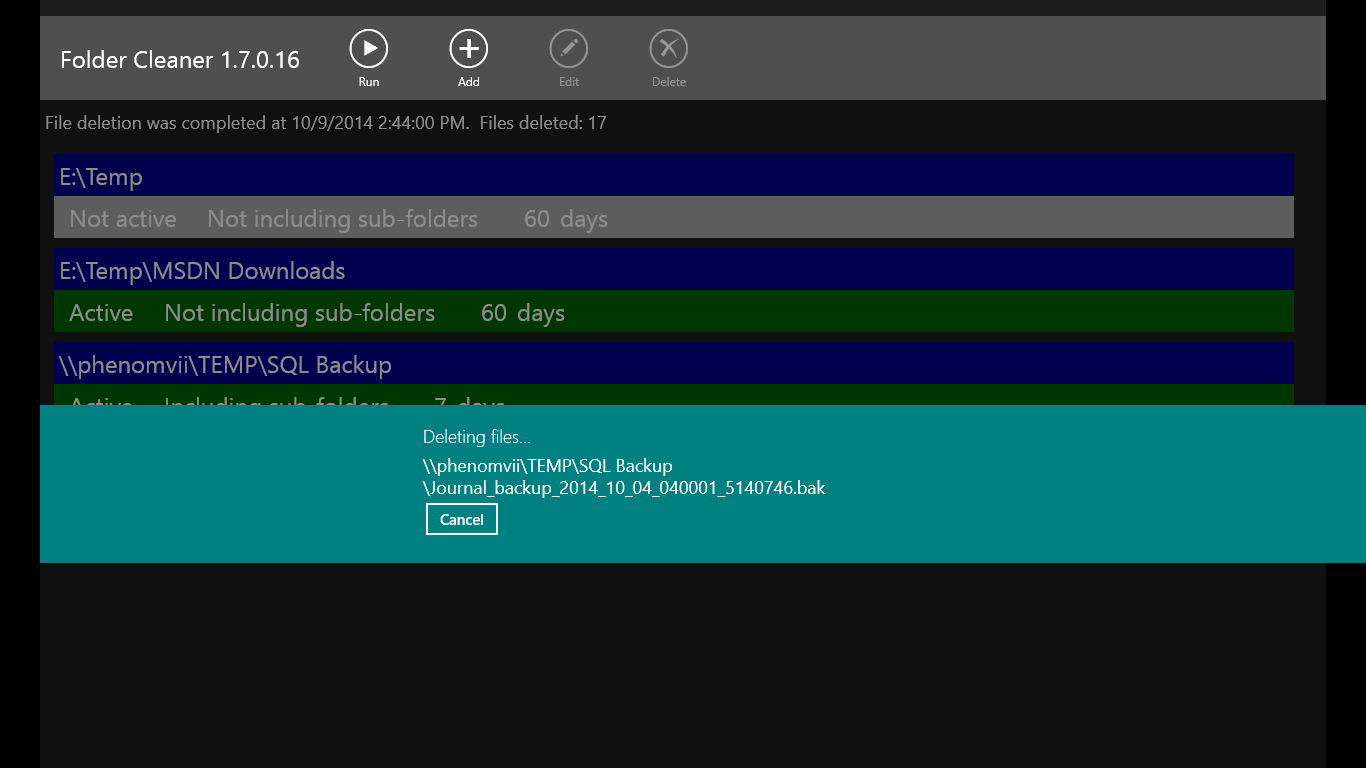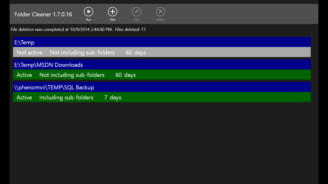 Delete old filesDelete files of multiple foldersEach folder has its own configurationSub-folders can be included in cleaningChoose to send files to the recycle bin or delete them permanently