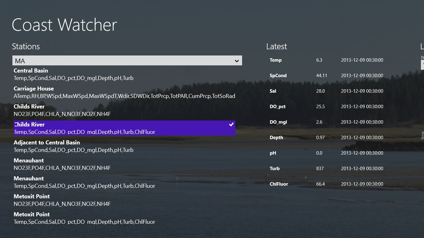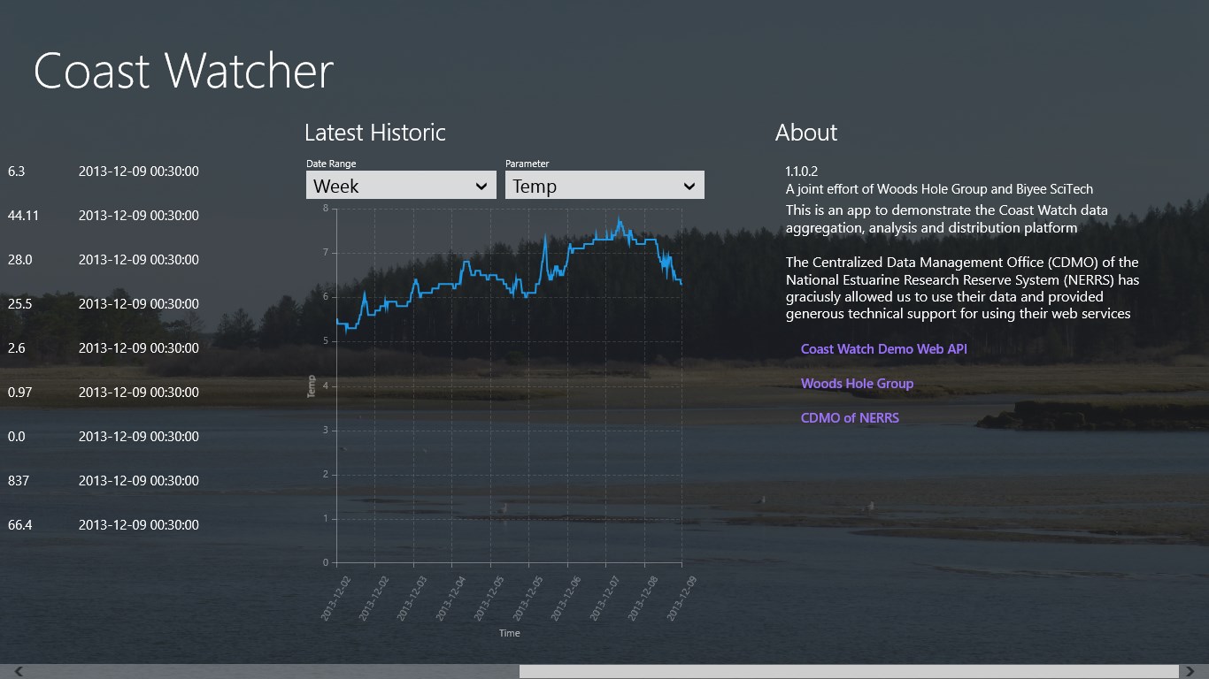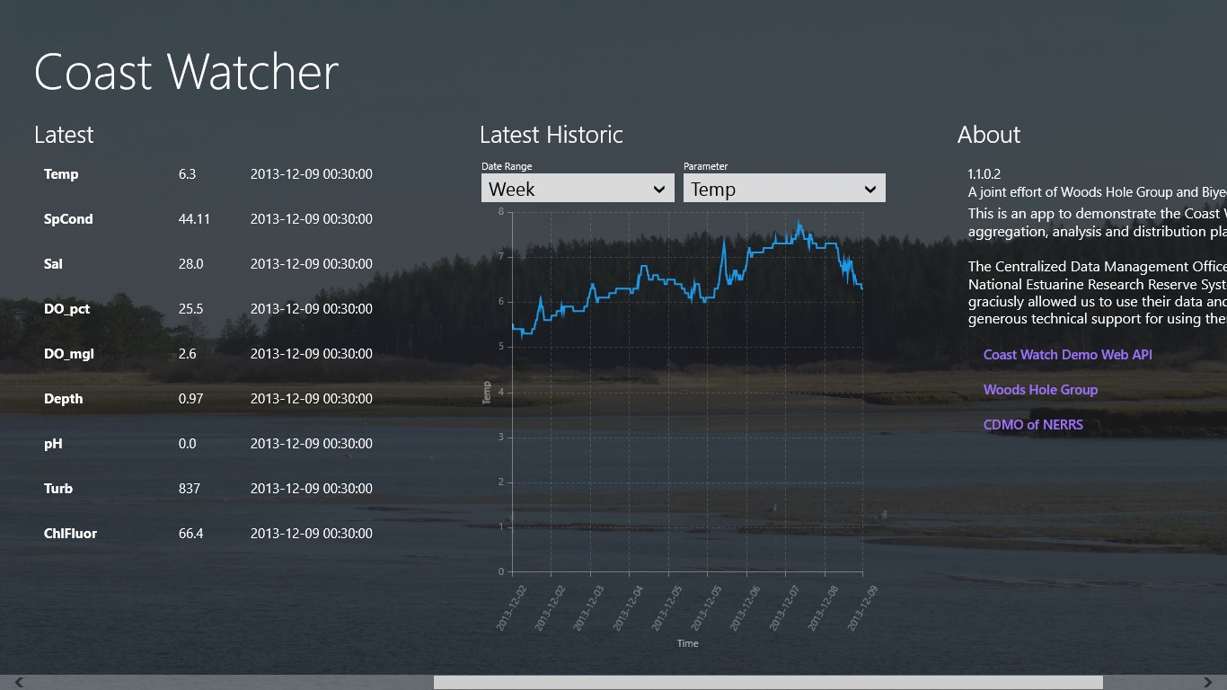 Coast Watcher is an app demonstrating the power of Coast Watch Marine Data API platform. It allows the user to monitor coastal water and weather conditions of any given location among a large number of selections. It currently provides the latest data and historic data provided kindly by the Central Data Management Office (CDMO) of the National Estuarine Research Reserve System (NERRS).