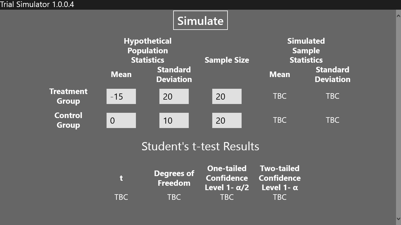 Trial Simulator simulates the sampling and t-test of two groups of independent, normally distributed data such as the treatment and the control arms of a clinical study. To carry out the simulation, the mean and the standard deviation of each group, which are unknown normally, need to be hypothetically specified. The simulation generates random numbers as samples based on the specified mean and standard deviation. It shows the relative distribution of the sampled data in the charts above and below the button Simulate, then it computes the sample statistics – mean, standard deviation, t value of Student’s t-test, one-tailed and two-tailed confidence levels.