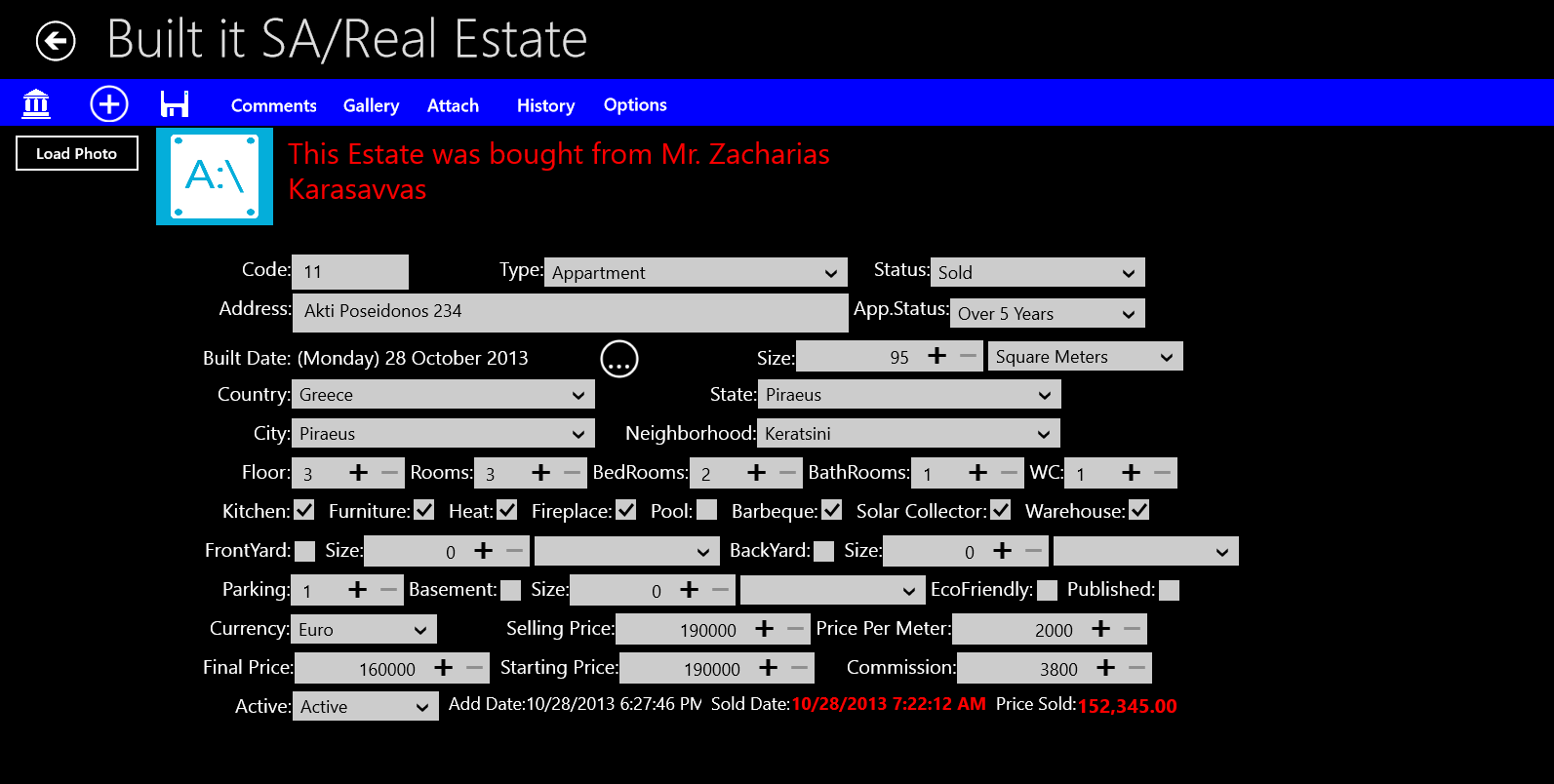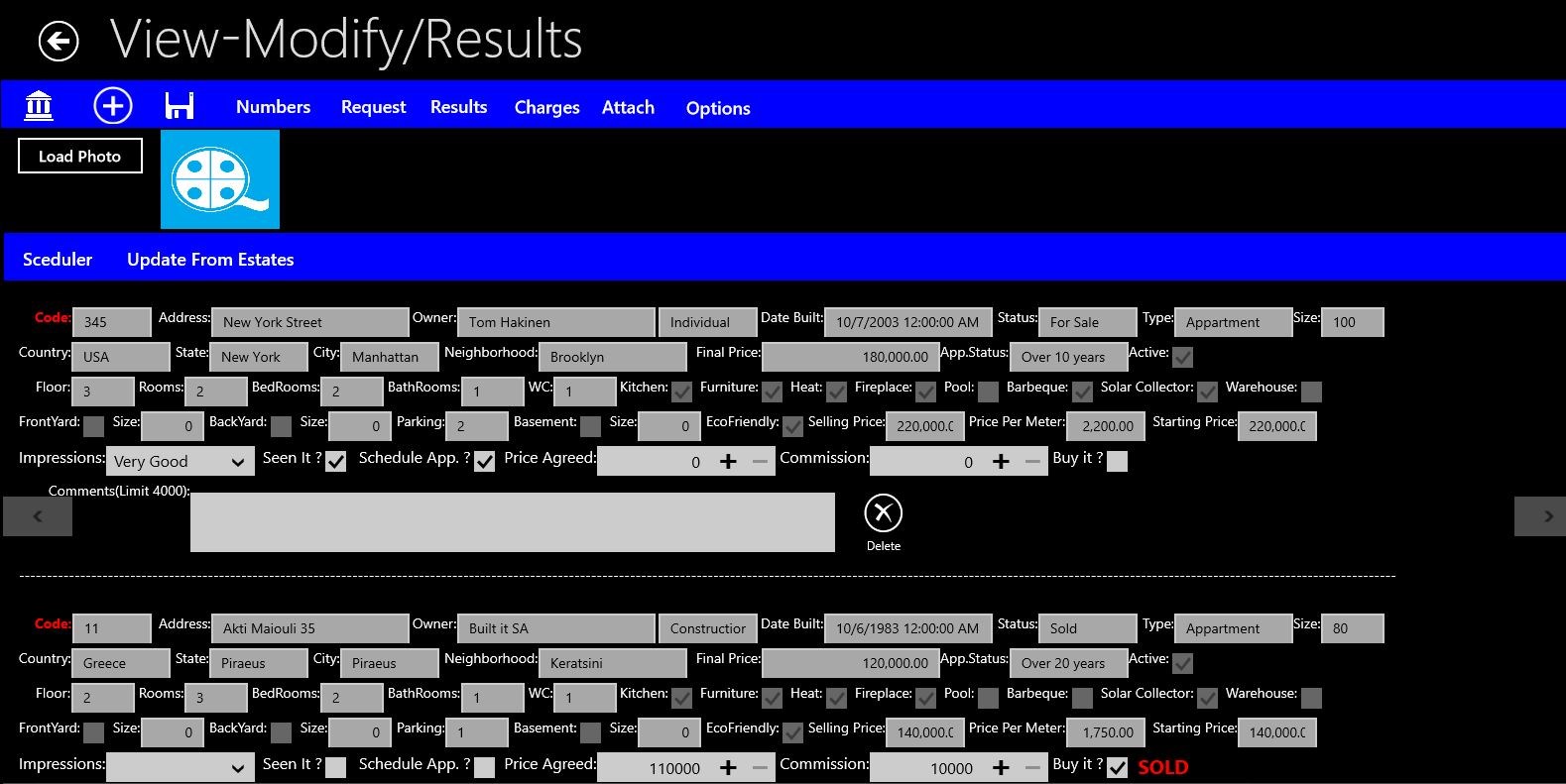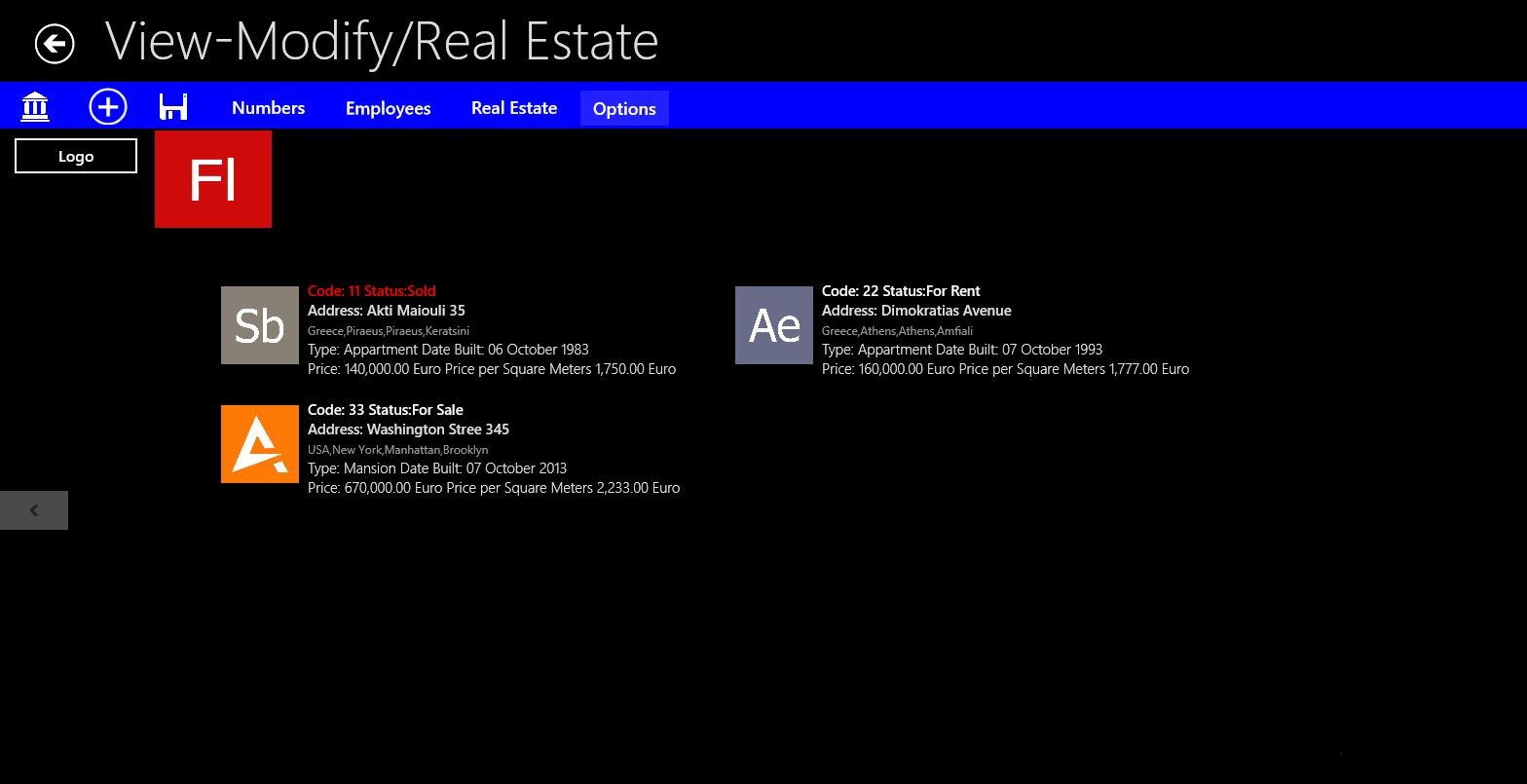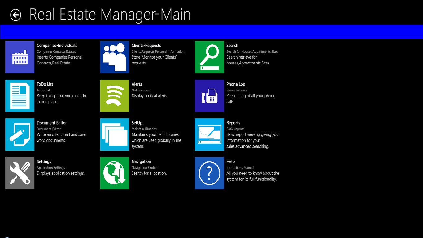 Create your Companies-Individuals Real Estate Properties.Create your Clients\' Profile. Keep all their Contact Details in one place !Record and keep in your local database your Clients\' requests.Use advanced Search features for proposing your Client , Estates.Schedule Appointments.Create Alerts so the system will automatically inform you for your urgent jobs !Add Reminders!Keep a log with your Phone calls.Monitor your sales using the Reports !Capture video or photo of the Estate and attach them directly to your Client\'s Profile ! Add Audio notes to each Estate.Live Tile which informs you about the latest appointments and alerts.Navigation , Basic navigation queries with instructions while you are On The Go!Customize your application according to your needs.A Complete Manual is embedded about how to operate the System and use it in its full functionalityExport your data to ExcelCreate , load ,modify your word documents from inside the App with our New Rich Text Editor