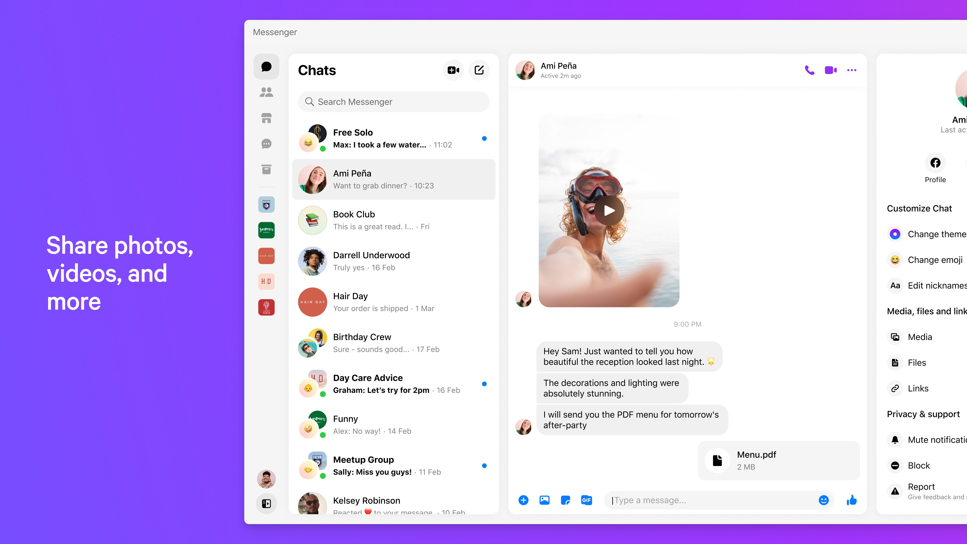 Skip the hassle of email and send photos, videos, or files up to 25MB (PDF, Word, Excel, Doc) right in your chat with friends in Messenger.