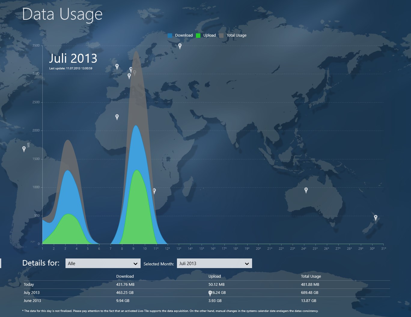 The SpeedMonitor measures the upload and download speed as well as the round trip and loading time and transmits these data to a history. So you can view, analyze and contrast the measured data at any time. You can also monitor the data usage of your internet connections splittet by time and network.