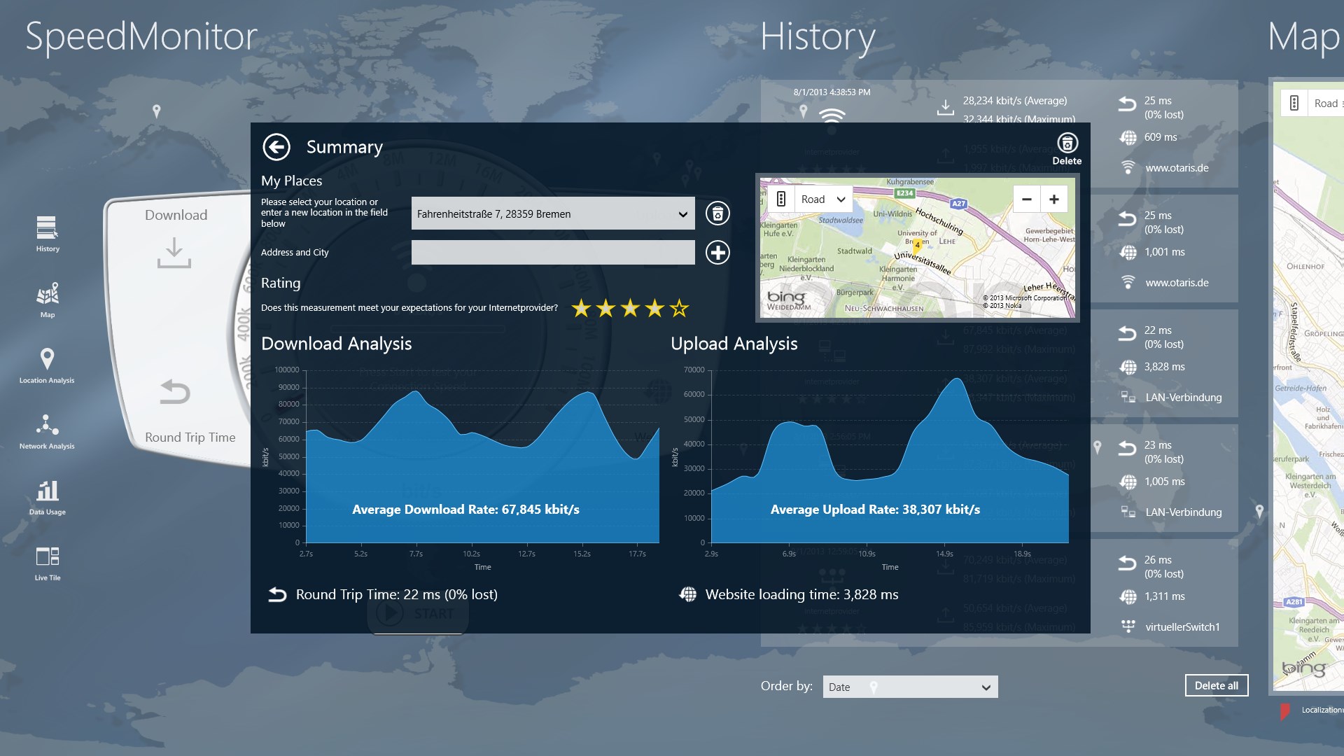 Measuring upload speedMeasuring download speedMeasuring round trip timeMeasuring loading time of webpagesEvaluation of the measured velocityPositioning of the measurements on a mapComparison of locations or connectionsHistory provides different informationSpeedMonitor Live Tile monitors connectionMonitor data usage of internet connectionsFor professionals: configuration of own server