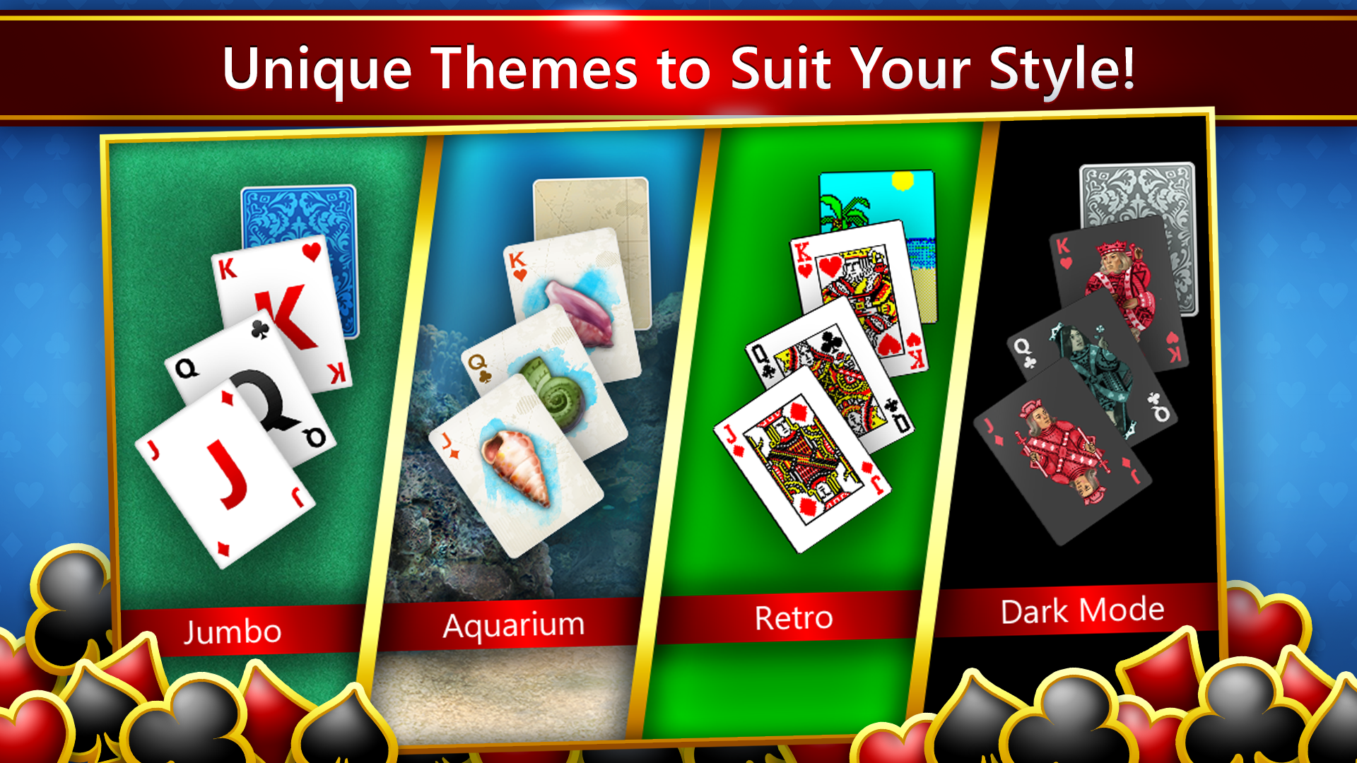 Microsoft Solitaire Collection features several themes to make your card game match your mood. From the simplicity of “Classic”, to the serenity of an Aquarium, the relaxation of the Beach, the sophistication of Dark Mode, or even traveling back in time to enjoy Retro card backs from the 1990s version. With so many to choose from, which one will become your favorite?