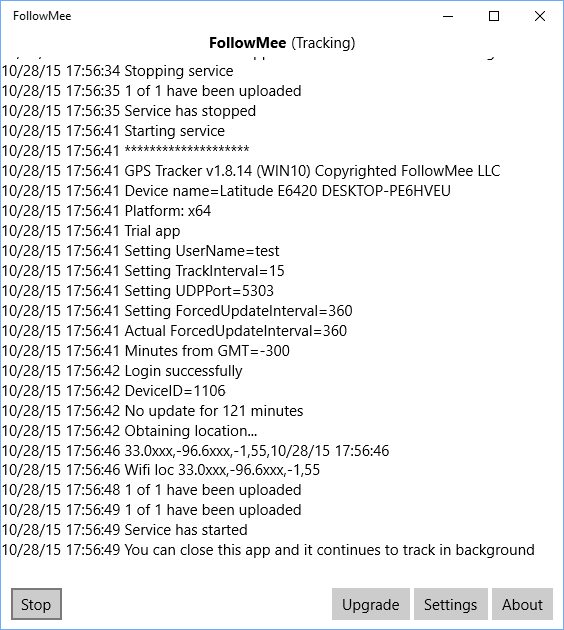 FollowMee GPS Tracker tracks location of a Windows 10 device (laptop or tablet). Installing this app to a device that you want to track, it quietly records its locations (GPS, WiFi, or cellular triangulation) and uploads to a secured server. To monitor location of your tracked device, you simply open the FollowMee web site (http://www.FollowMee.com) in any web browser. Using this app, you can track the whereabouts of your Windows 10 devices, both personal and business. For business, you can track your employees (sales agents, technicians, delivery personnel etc) through tracking the devices that they carry.