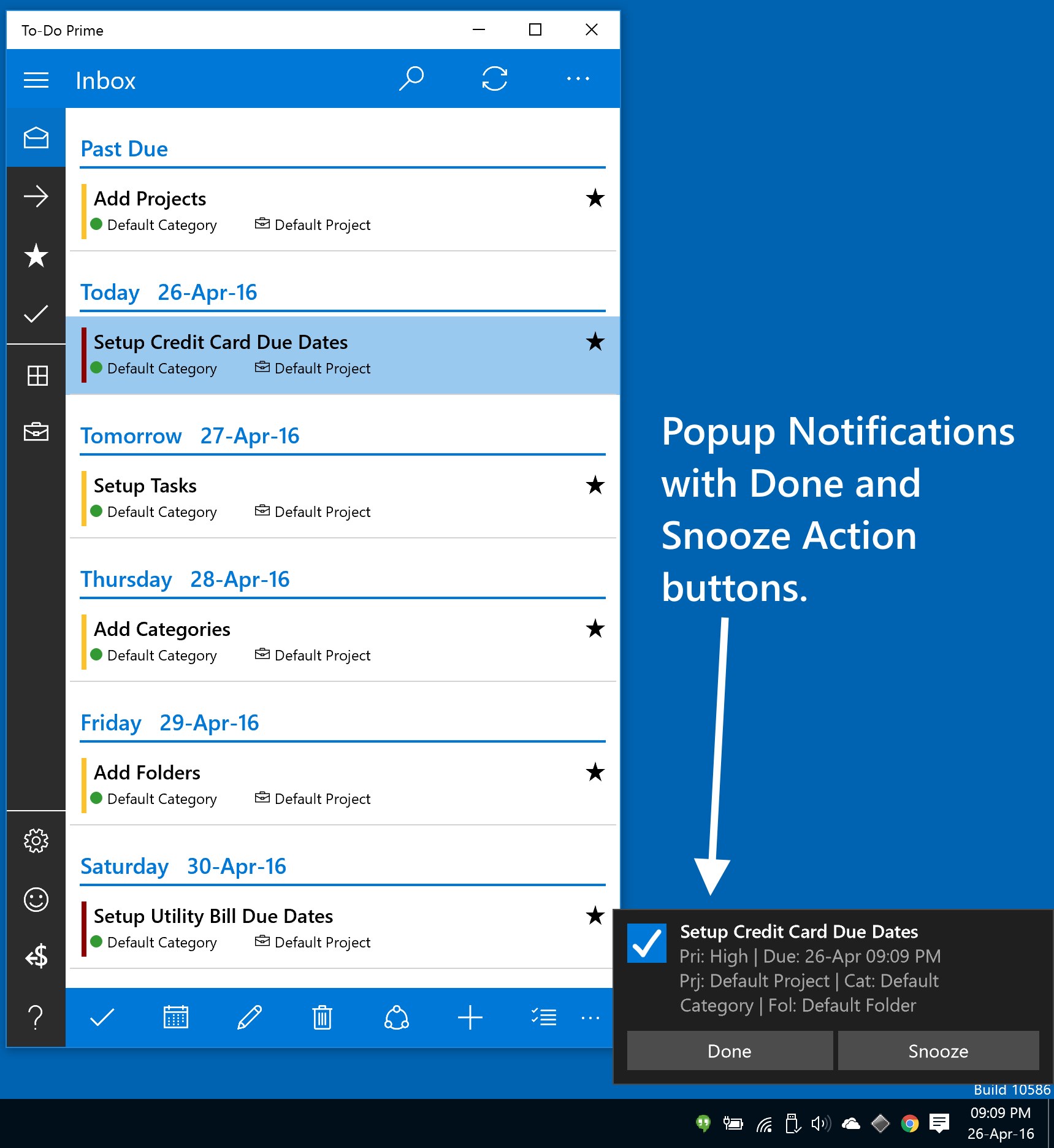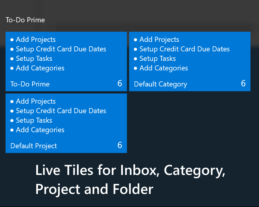 ★ Syncs with multiple Windows 10 devices.★ Sync with Google/Hotmail/Outlook.com/Live calendar.★ Organize todo\'s/tasks into Projects, Colored Categories and Folders.★ Quickly add to-do/task from home screen.★ Scheduling of todo\'s/tasks using Start and Due Date & Time★ Add Reminders/Alerts to your to-do. (Minutes, Hours, Days, Weeks before start/due date time)★ Repeating to-do\'s with end date. (Daily, Weekly, Monthly, Yearly)★ Actions: Assign actions like Email, Text, Call and Visit Website and easily launch them from appbar.★ Easily Search to-do\'s.★ Prioritize todo as Low, Medium, High or Top.★ Add note and tag to to-do.★ Backup/Restore to-do\'s to OneDrive and Google Drive★ Easily postpone/reschedule to-do.★ Live Tile shows latest to-do\'s.★ Starred to-do\'s★ Print To-do\'sAdverstisements are shown after 15 days and can be removed for small in-app purchase.