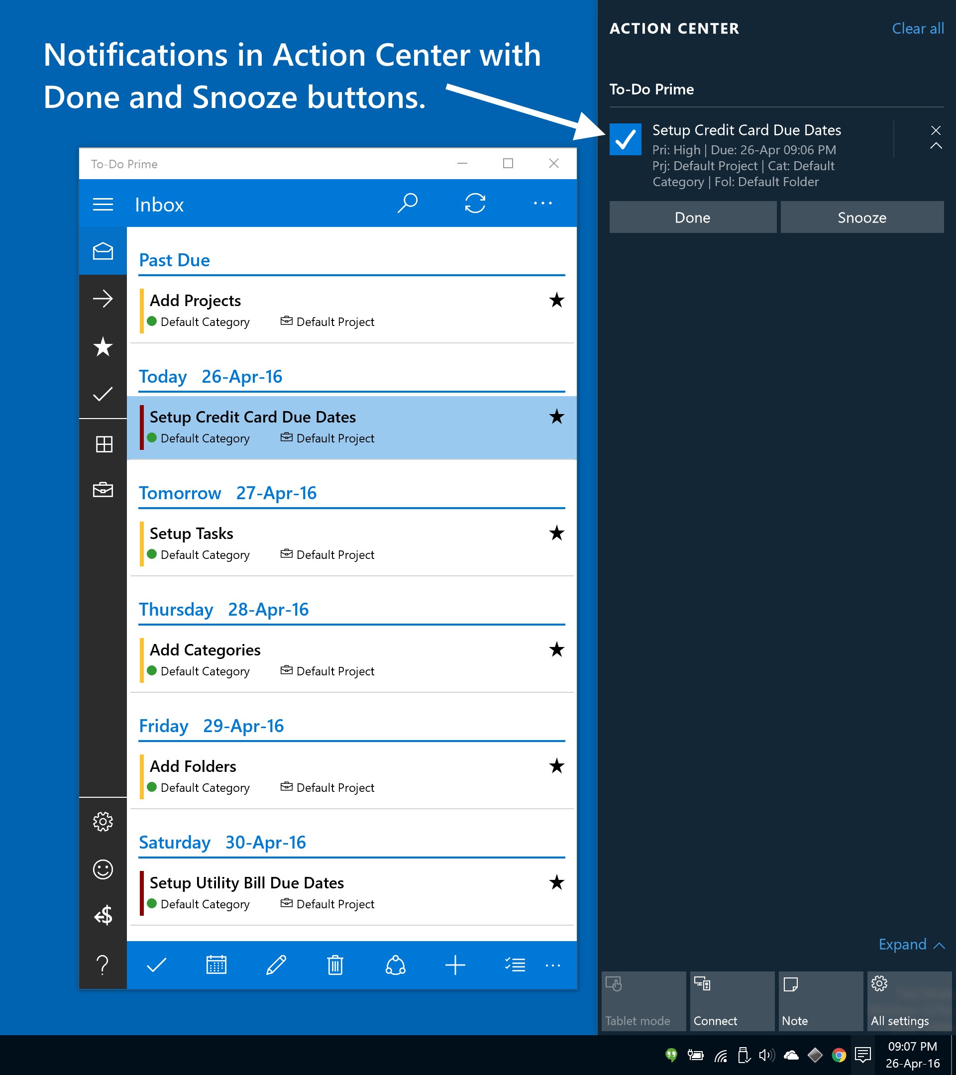 Sync to-do's with Windows 10, Windows 8, 8.1 and Windows Phone 8 devices.