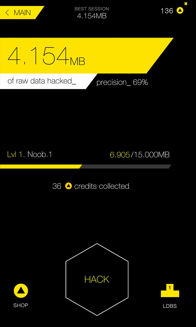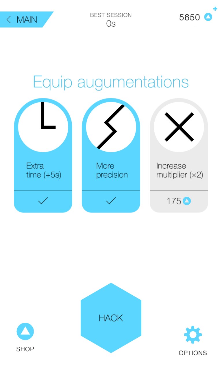 Use your hard earned credits to equip augumentations to boost your hacking skills (to improve your precision, get more time for hacking, and multiply your score right from start). Courtesy of Augtech Corporation.