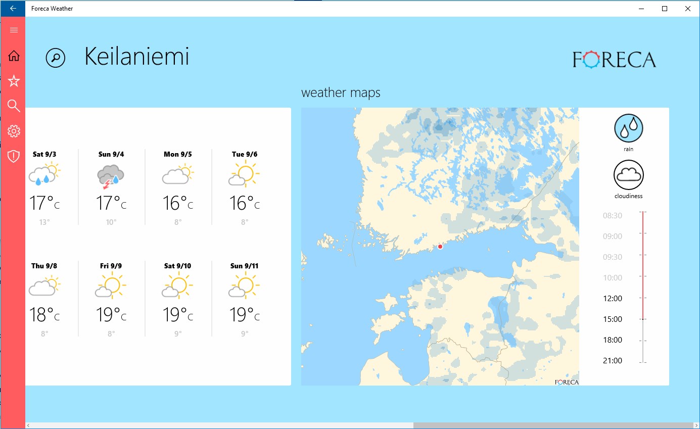 ForecaWeather provides current conditions, 10 day weather forecasts and weather animations for any location world-wide. You can choose from over 140.000 locations.