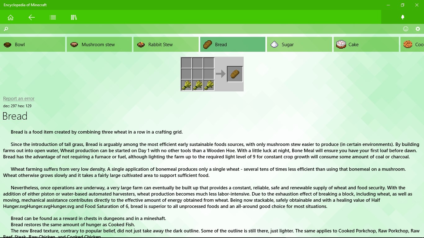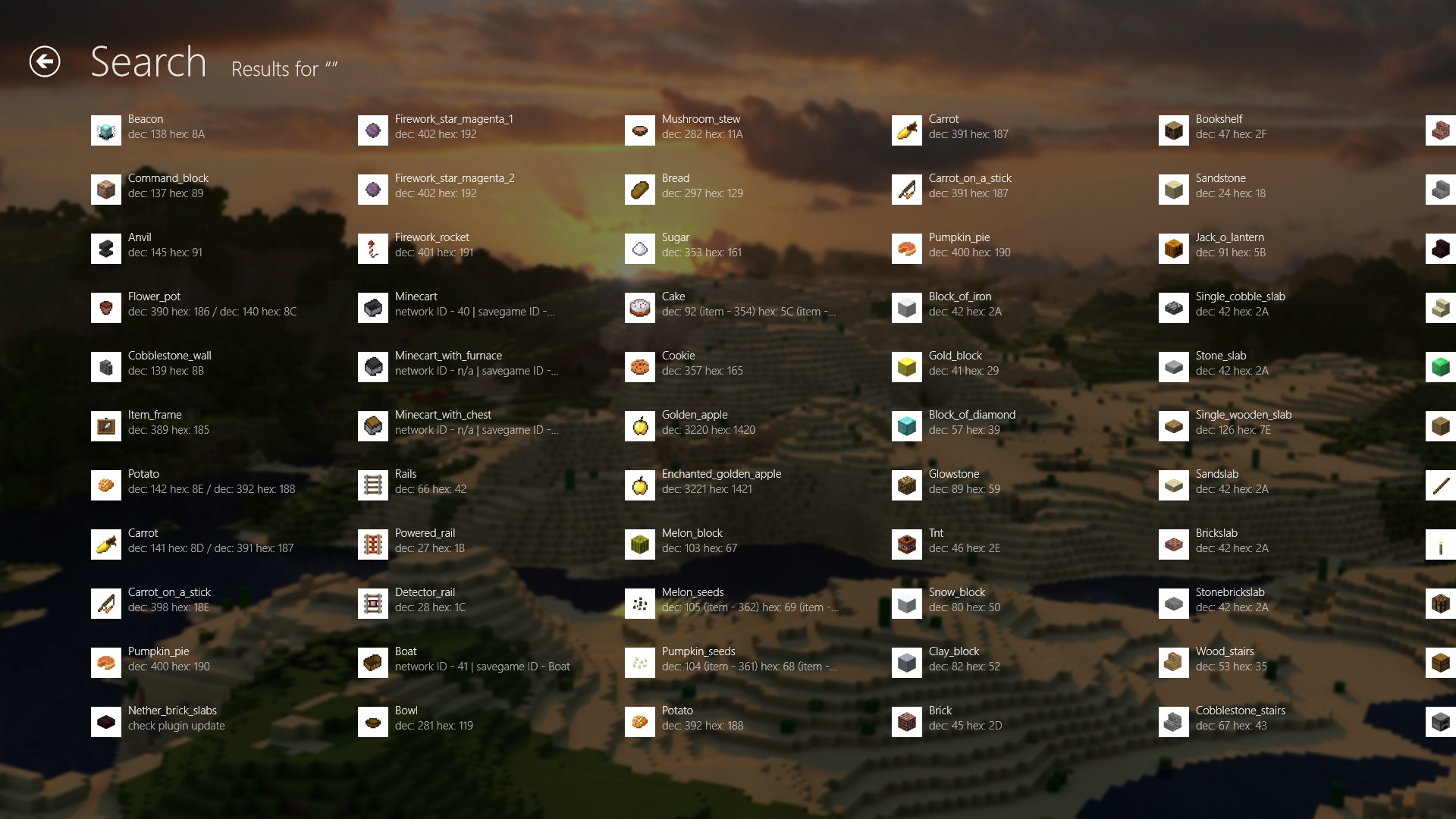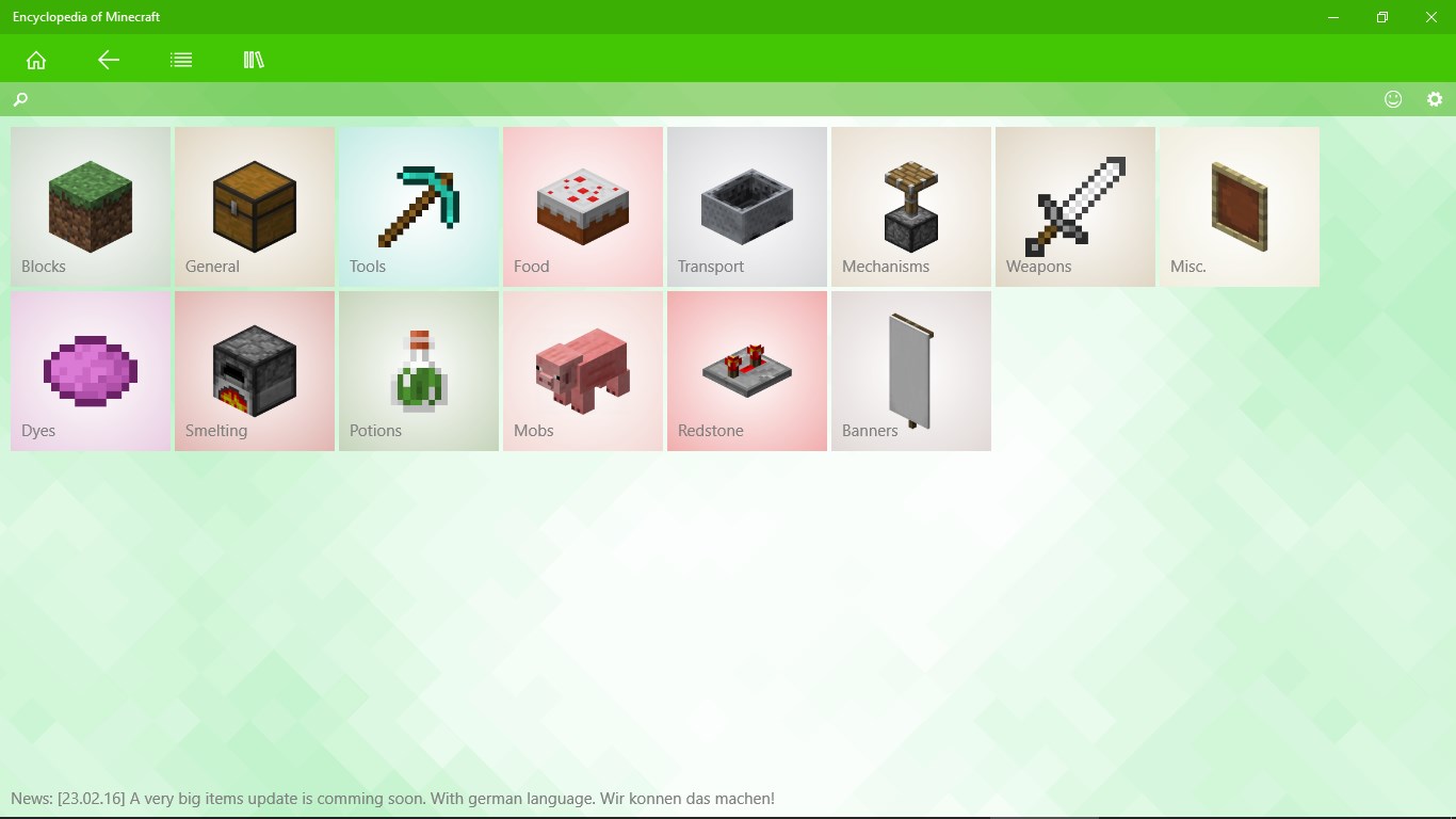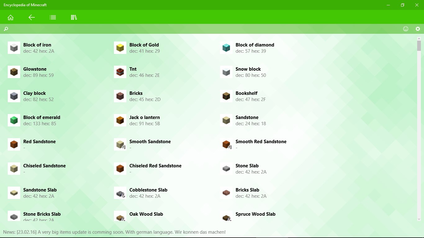 Use it as a companion app to learn more about various Minecraft objects including blocks, commands, crafting recipes, mobs and more. Add your own items with a special Plugin menu.