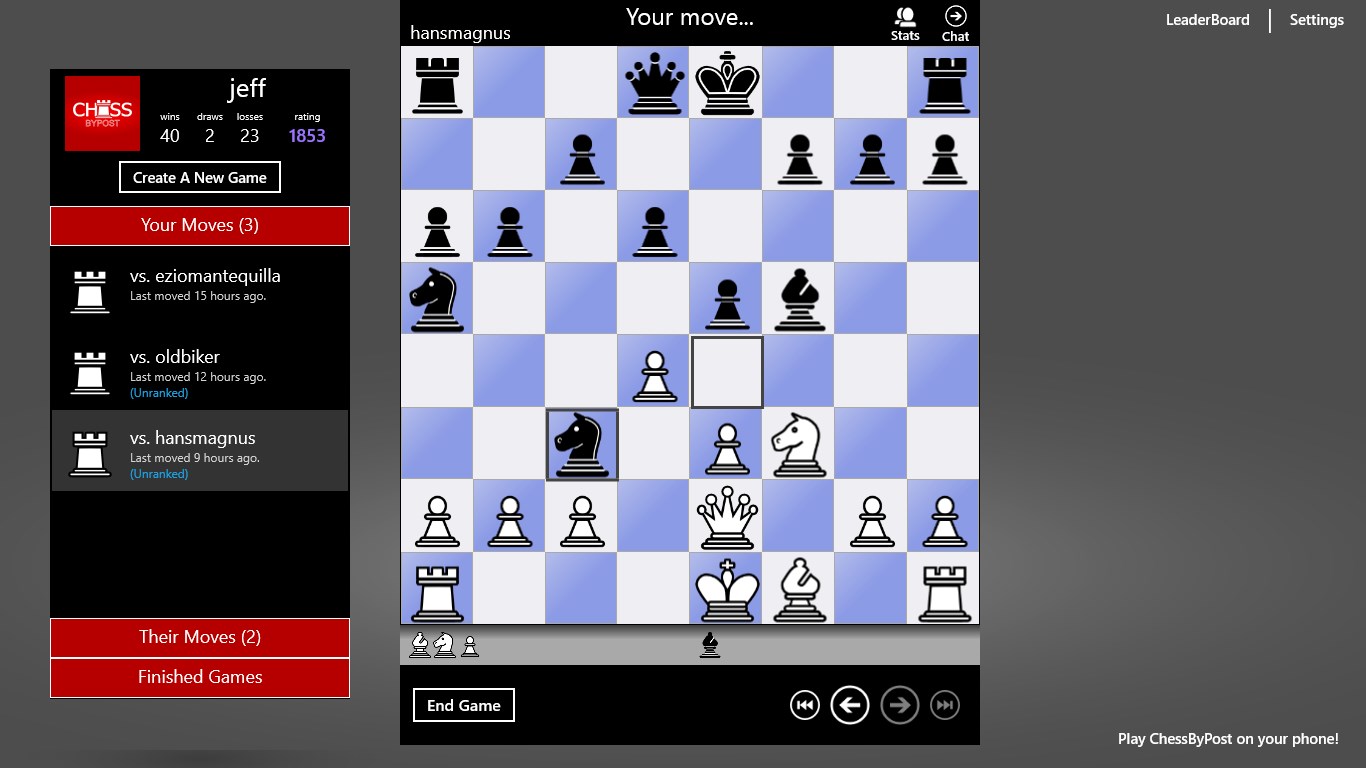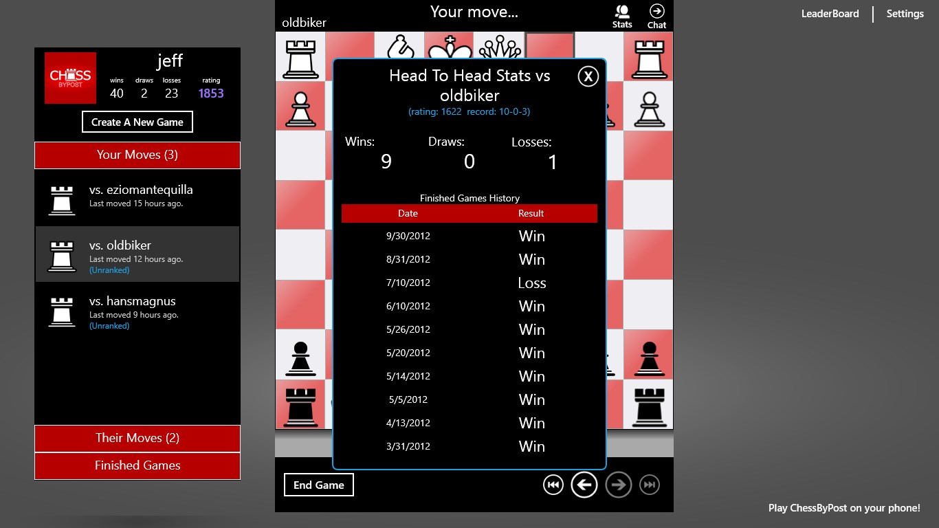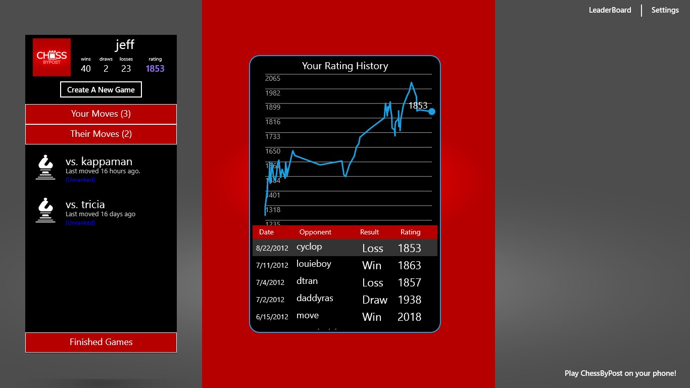 Chess By Post is the only cross-platform chess game that keeps track of your skill level and always matches you against players of similar ability to your own. And since it is available for Windows 8 devices, iPhones, Androids, and Windows Phones, you can play your friends no matter what type of device they have.