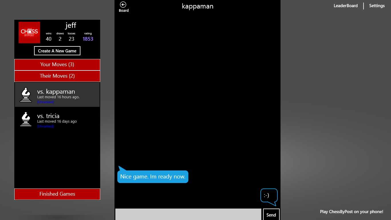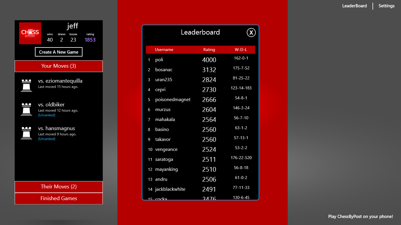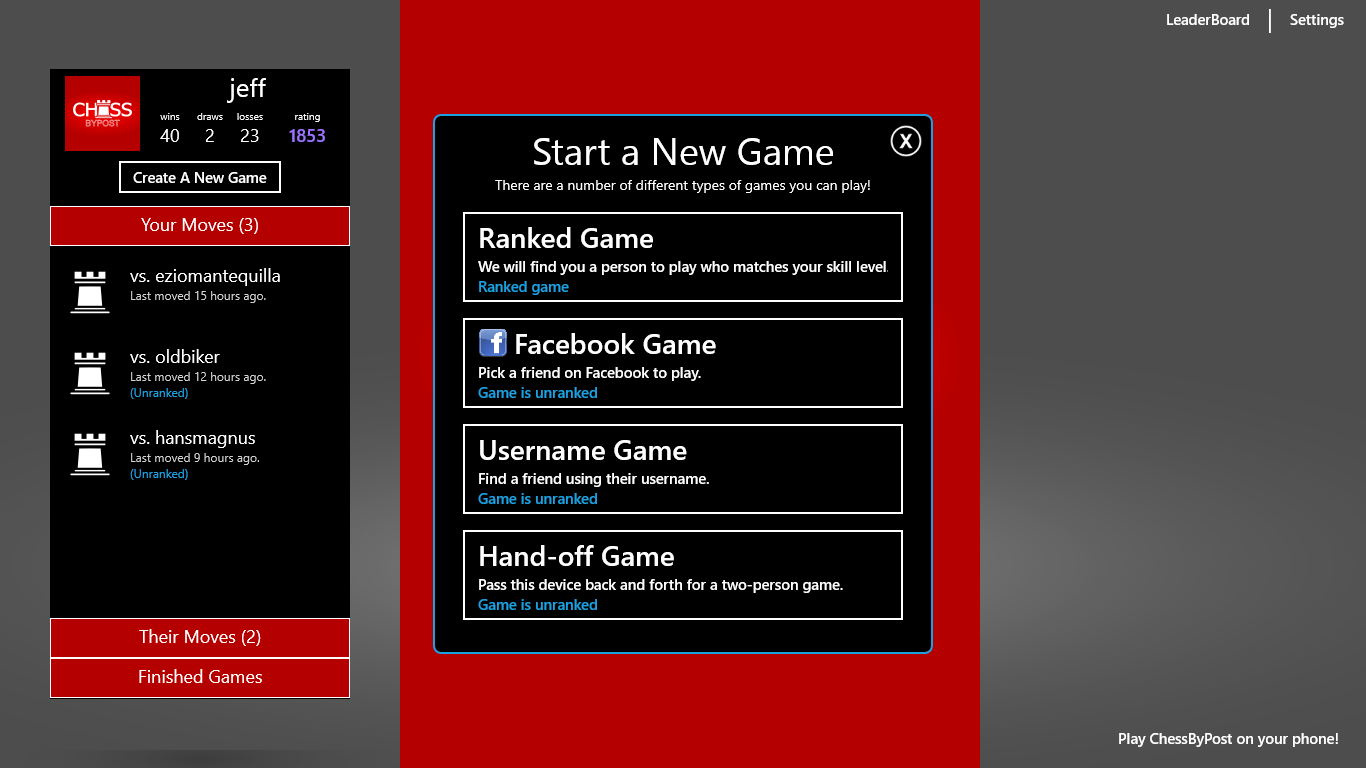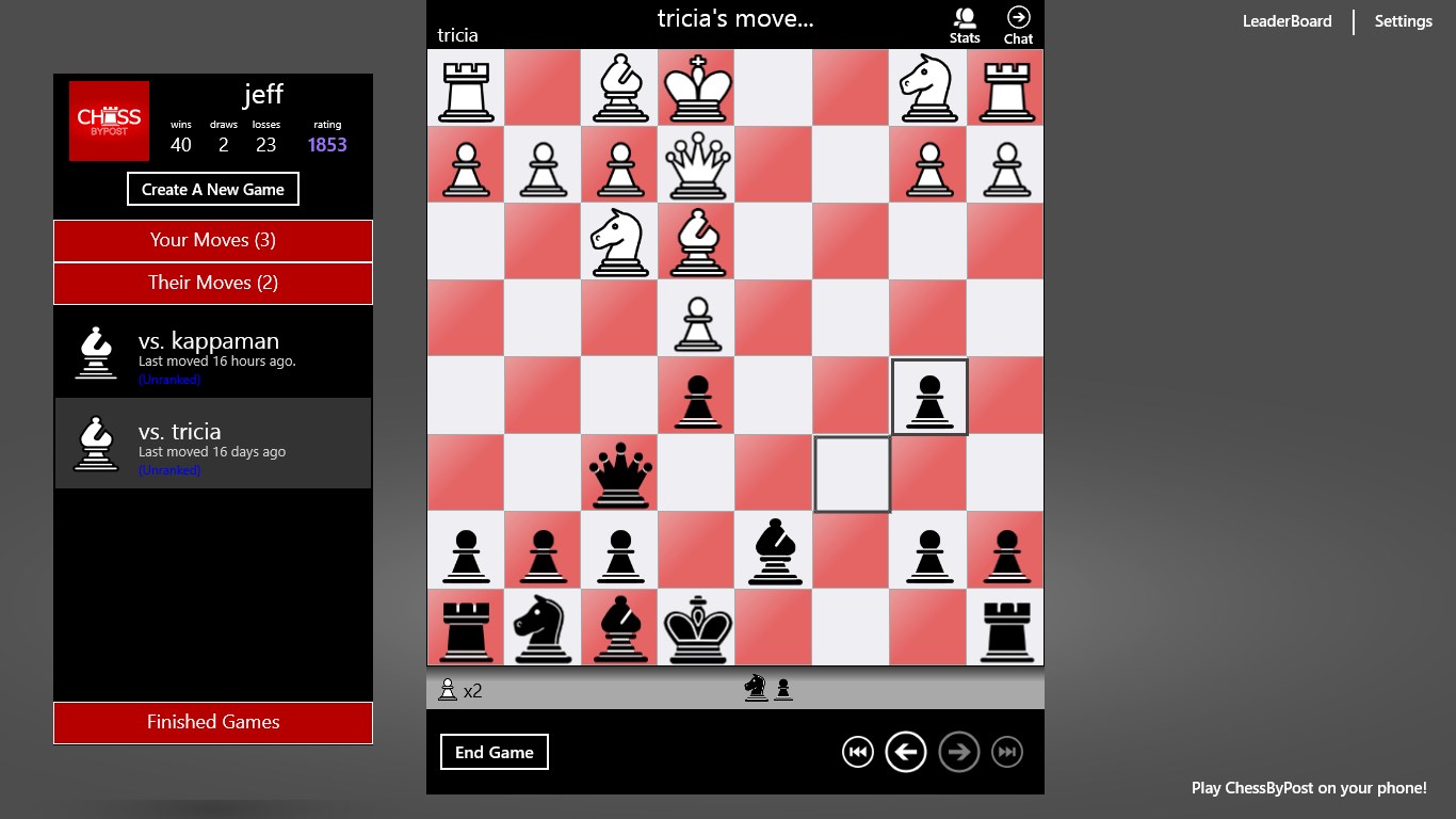 Chess By Post is the only cross-platform chess game that keeps track of your skill level and always matches you against players of similar ability to your own. And since it is available for Windows 8 devices, iPhones, Androids, and Windows Phones, you can play your friends no matter what type of device they have.