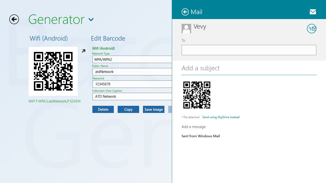 The generated barcodes can be shared through other apps (sent via email, posted to Twitter, etc.).