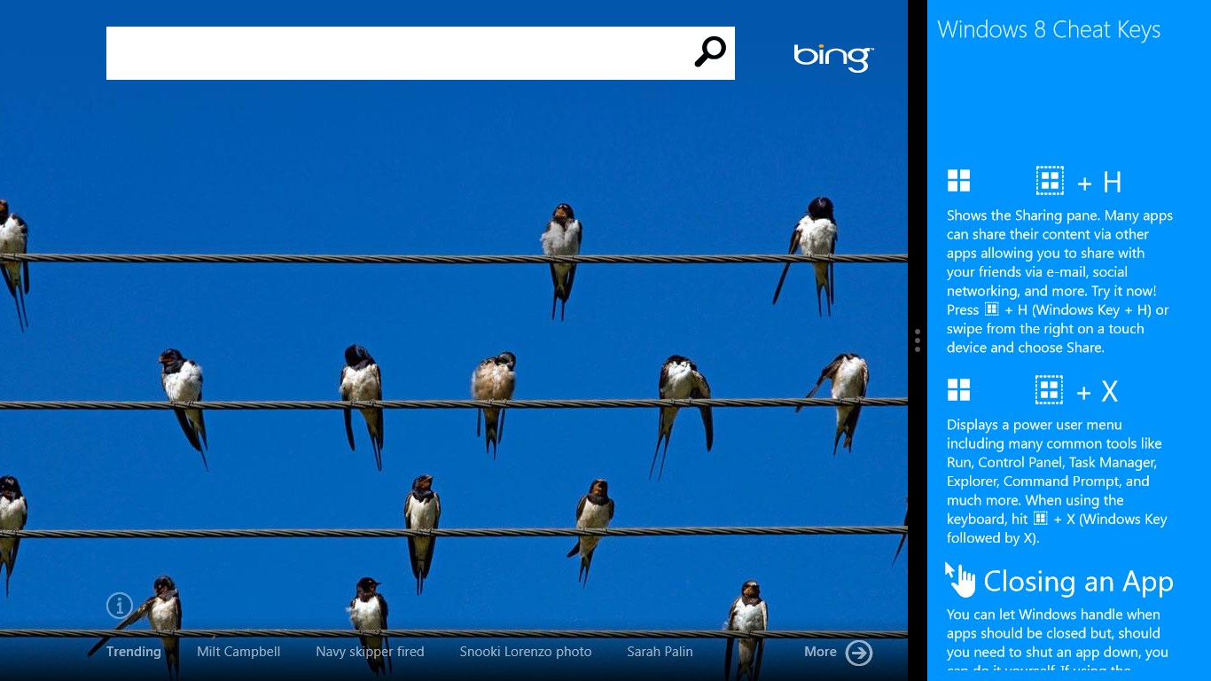 Learn Windows 8 shortcut keys, gestures, and features.Get notified of several tips daily to help build your repertoire, productivity, and, of course, impress your friends.Supports Sharing. Share tips with friends by e-mail, social media, and more.Search for tips within the app or from Windows.Toast notifications let you know when new shortcuts or tips are available.Live tile updates display new shortcut keys and tips on your Start screen.
