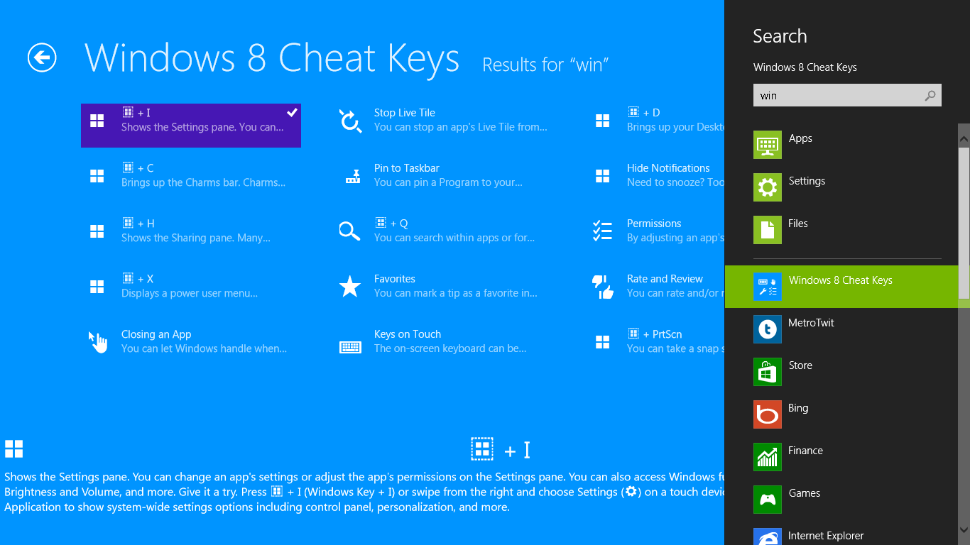 Windows 8 Cheat Keys will introduce you to keys and tips at only a few per day through toast notifications and live tile updates for maximum retention and understanding or you can now browse all available tips at once. Windows 8 Cheat Keys supports Windows 8 Search, Share, Notifications, and has an updating live tile.
