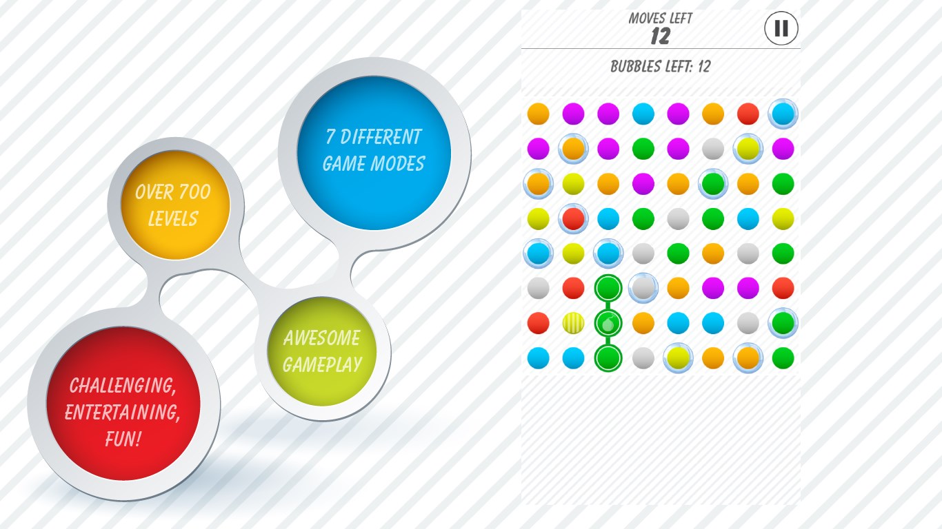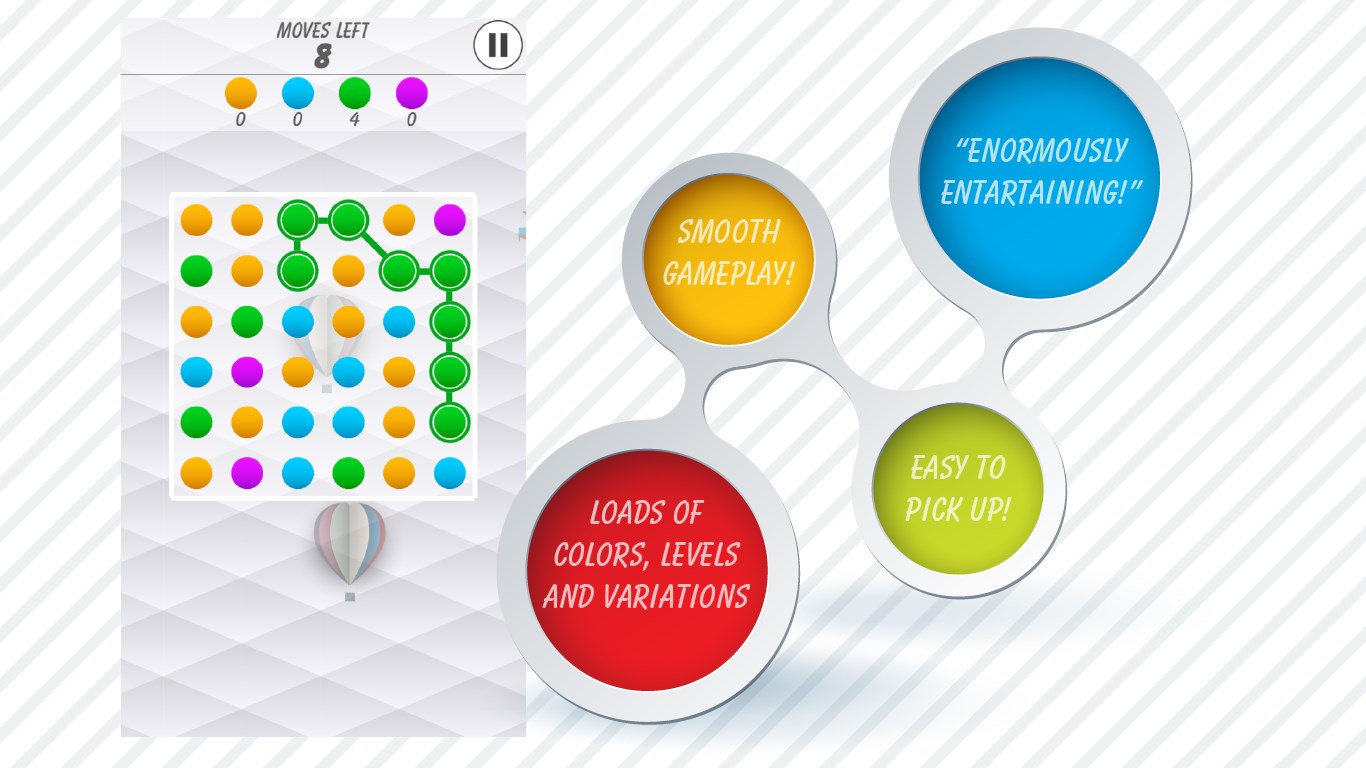 Match dots challenging puzzle gameBeautiful graphics and gameplayOver 700 unique levels7 different game variationsSmooth playSizzling sound effects