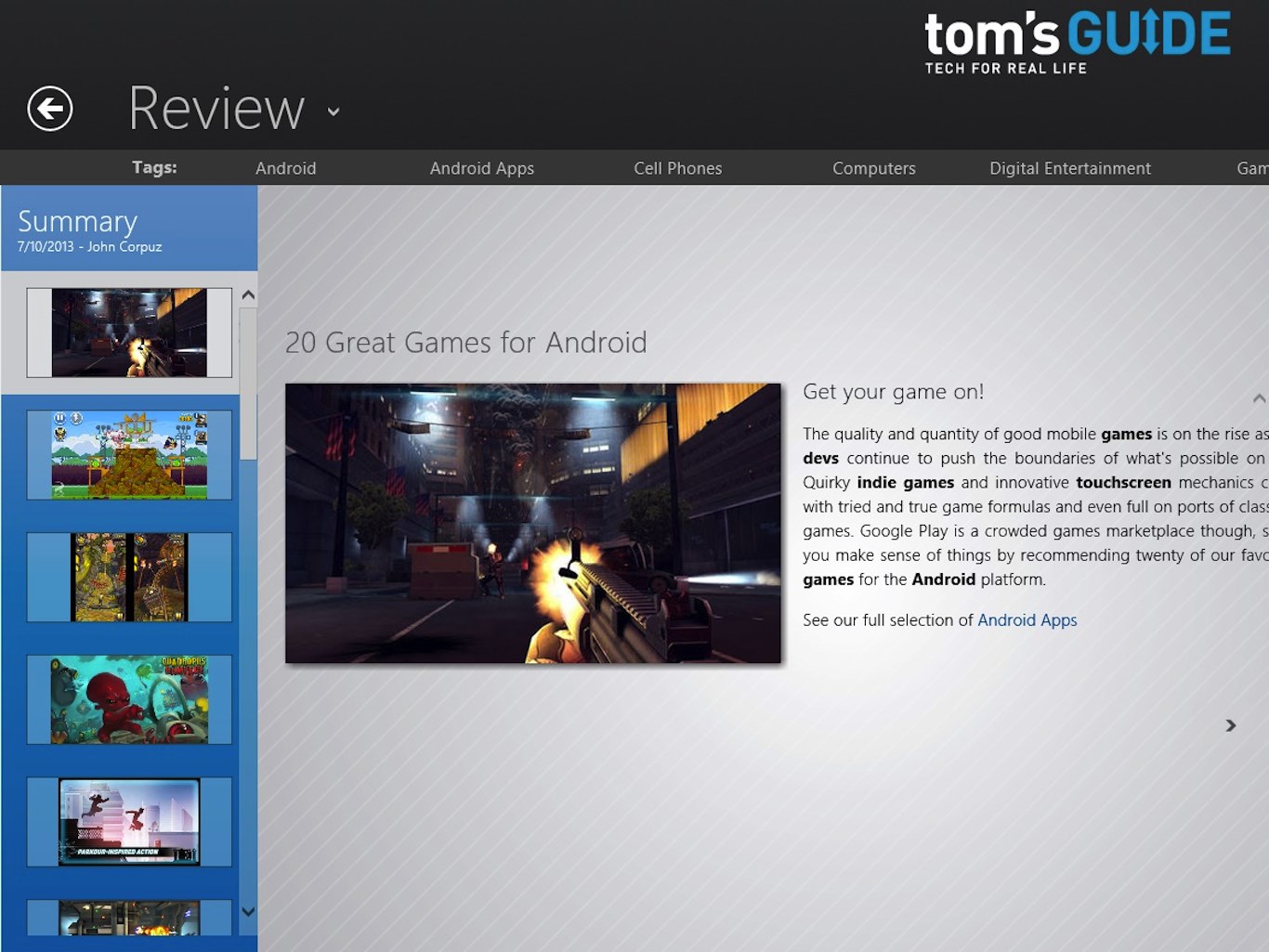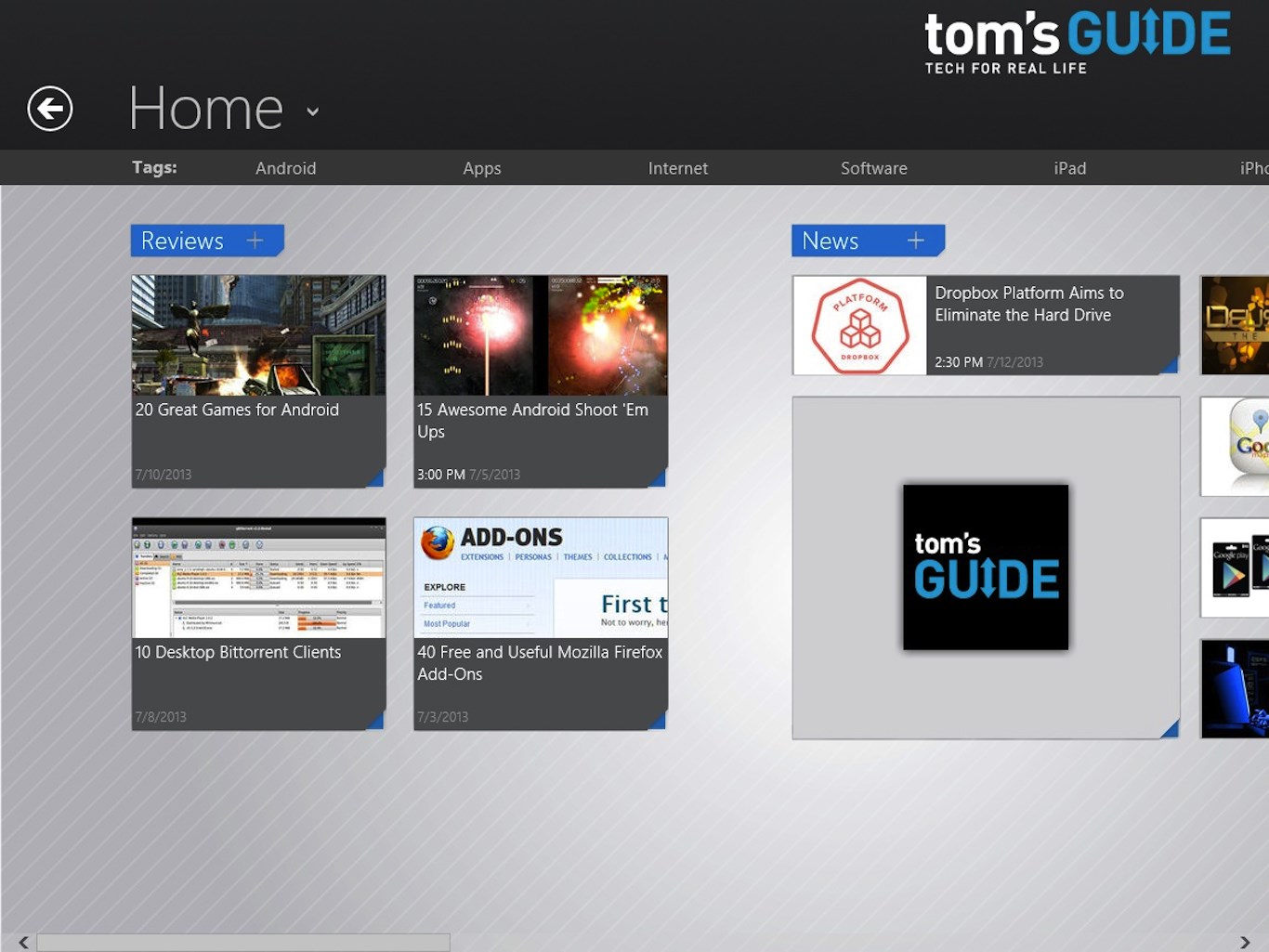 Get instant access to the latest news, reviews and guides on the latest consumer electronics. From phones, laptops, TVs, cameras, and more, Tom's Guide for Windows 8 allows you to quickly compare the latest gadgets and electronics.