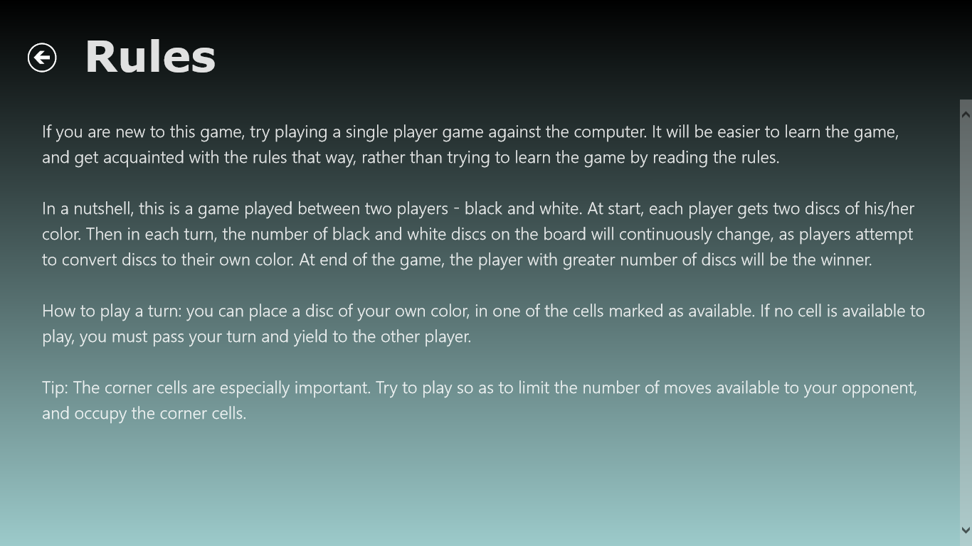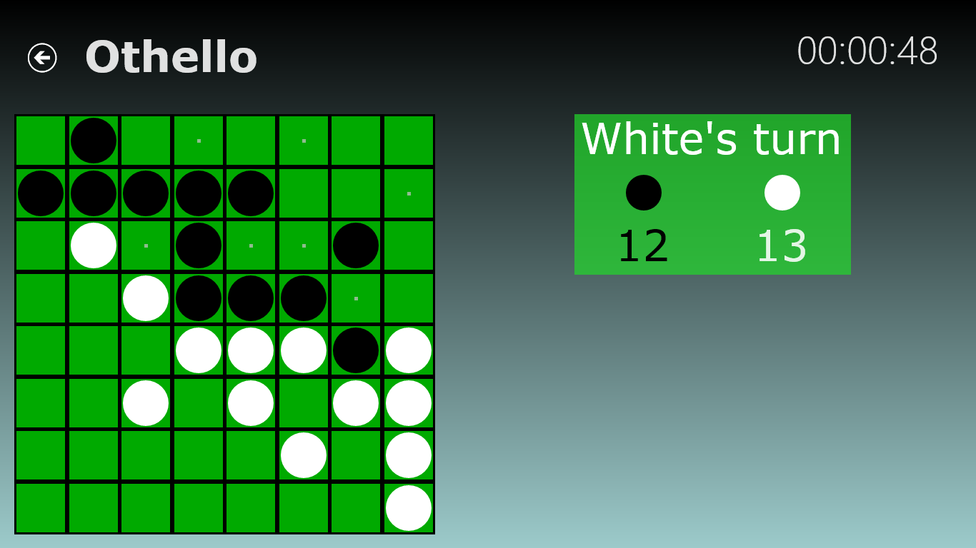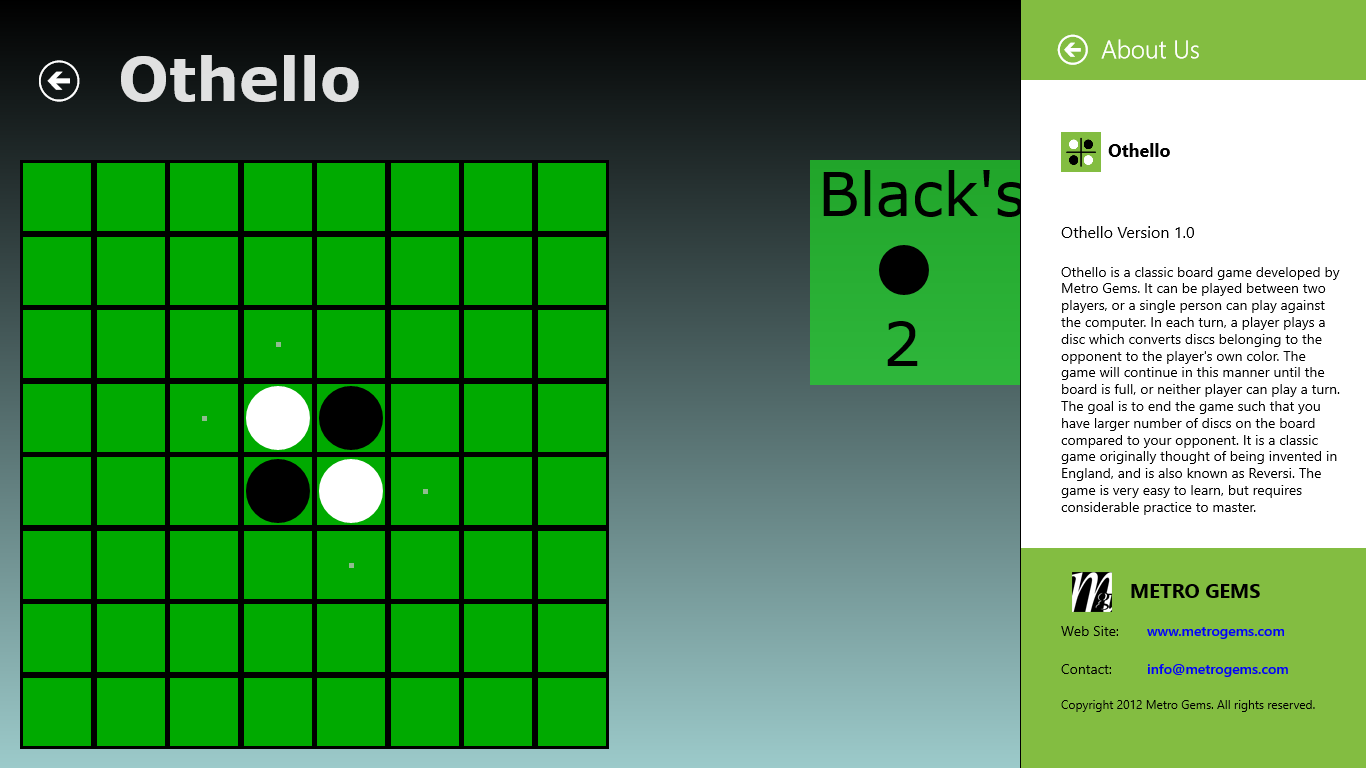 Othello is a classic board game developed by Metro Gems. It can be played between two players, or a single person can play against the computer. In each turn, a player plays a disc which converts discs belonging to the opponent to the player's own color. The game will continue in this manner until the board is full, or neither player can play a turn. The goal is to end the game such that you have larger number of discs on the board compared to your opponent. It is a classic game originally thought of being invented in England, and is also known as Reversi. The game is very easy to learn, but requires considerable practice to master.