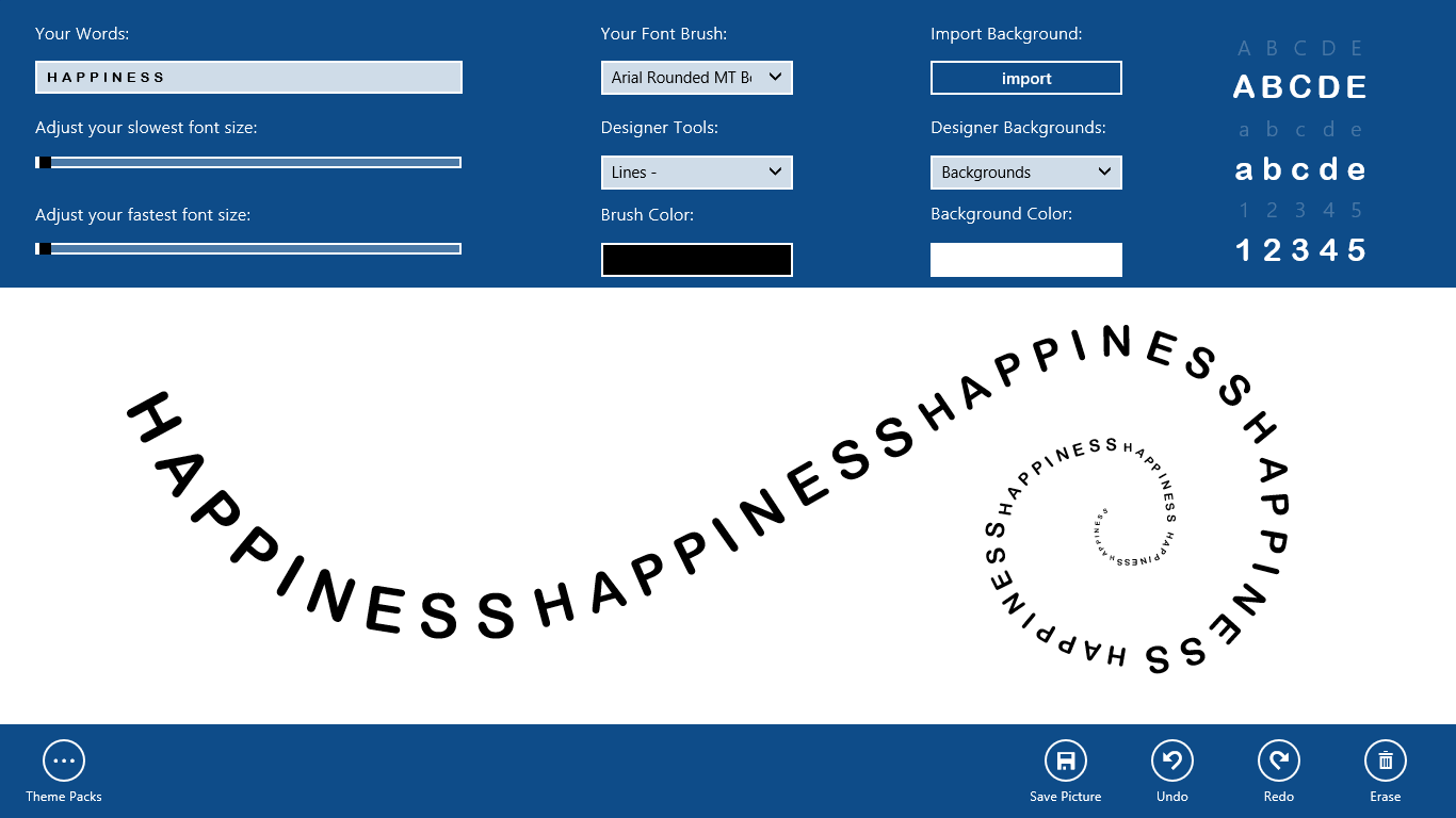 Updated for Windows 8.1! New designer brushes, new fonts and better performance. Words have been trapped in straight lines for too long...set your words free! wordBrush allows you to draw text freely on the screen, each letter following the trace of your finger as though you were painting with a brush. With support for over 200 fonts, 20 freeform brushes and the ability to import images, wordbrush becomes the perfect tool for creating unique photo captions, gorgeous desktop wallpaper and designer font layouts that would be nearly impossible on even high end image editing software. Break out of the textbox and set your words free!