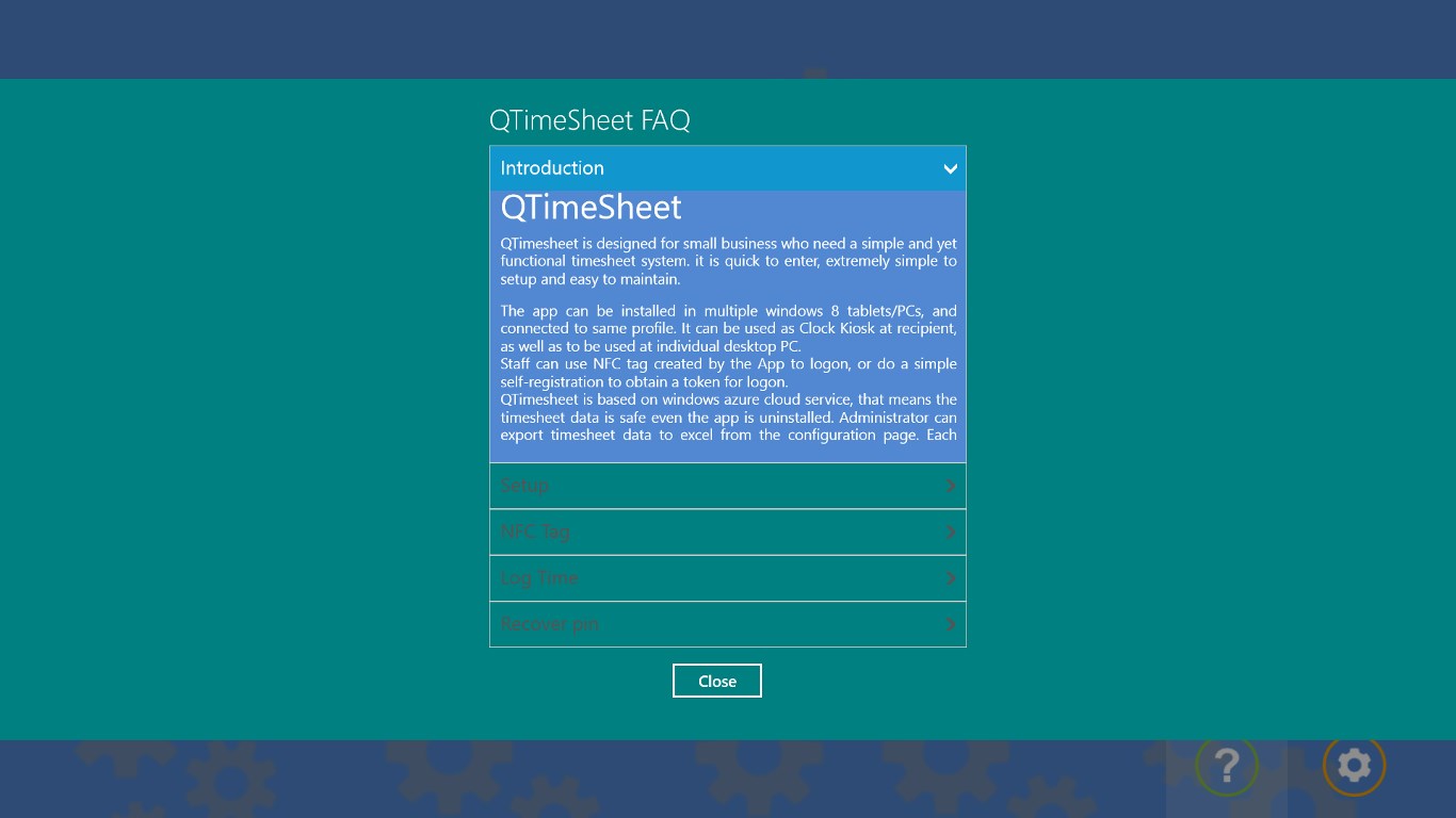 The app can be installed in multiple windows 8 tablets/PCs, and connected to same profile. It can be used as clock Kiosk at recipient desk, or used as tablet app for mobile workers, as well as to be used at individual desktop PC.