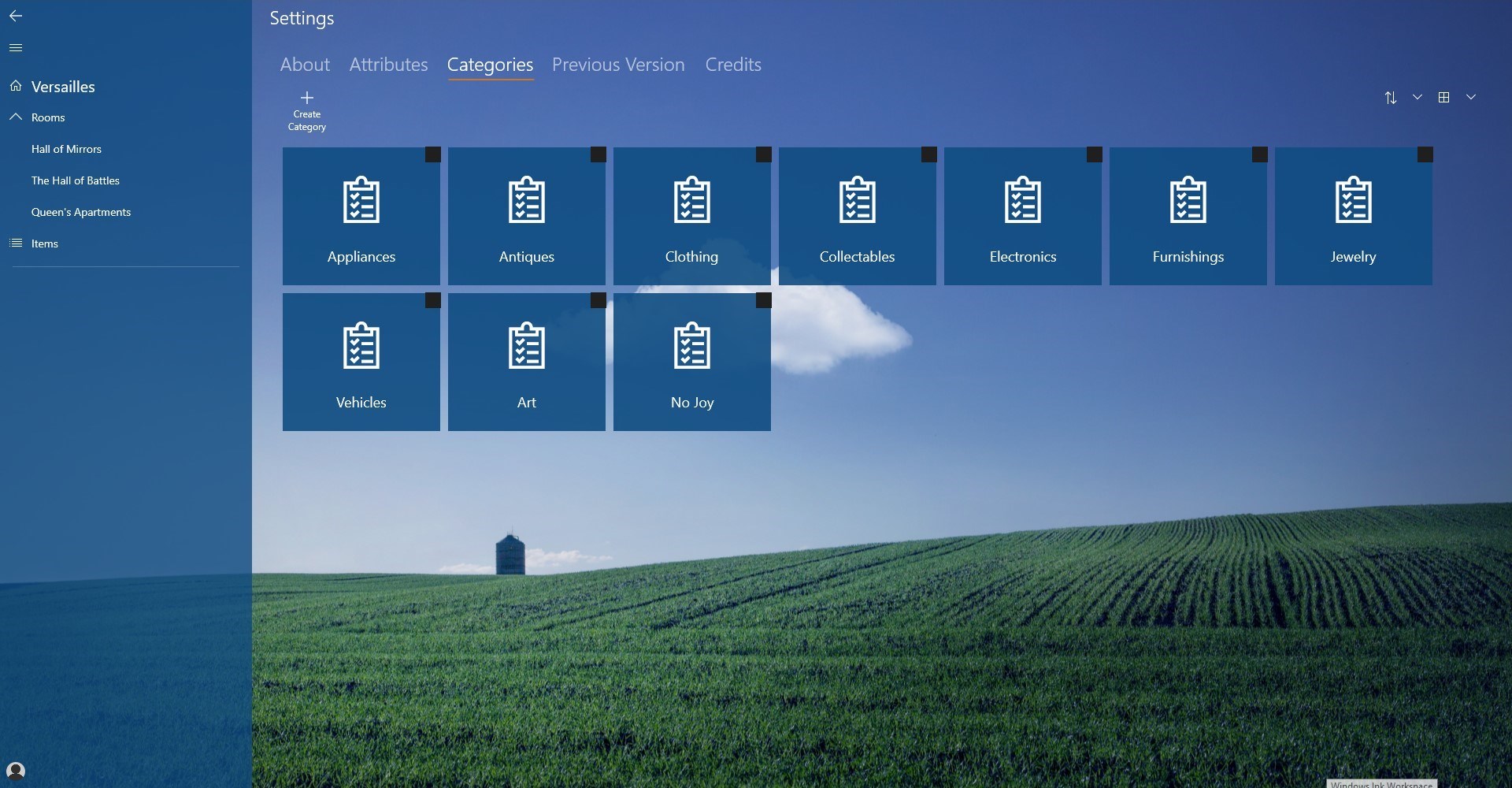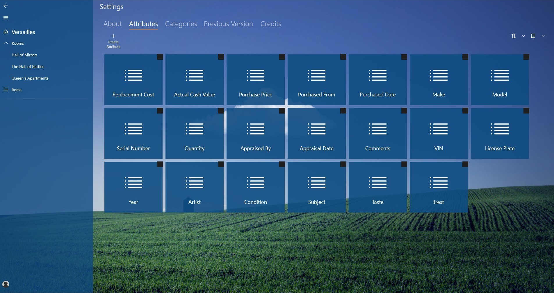 V 2.x Rewrite for Windows 10. No more syncing, everything goes to OneDrive directly. New: Attach PDF\'s, Excel spreadsheets and Word documents. Also support for >1 home, customizable categories and attributes. Installs sample "Versailles" data and images.