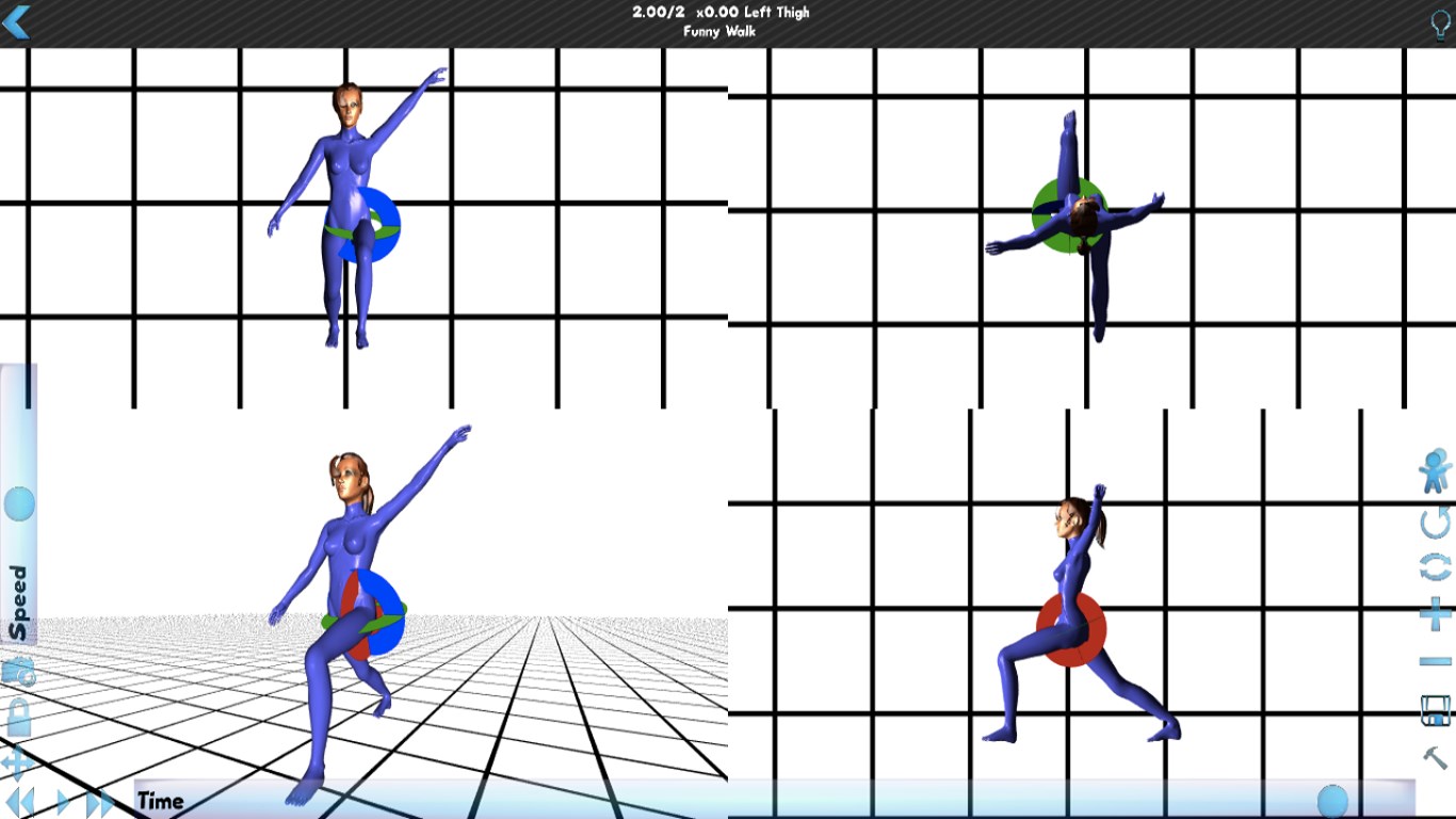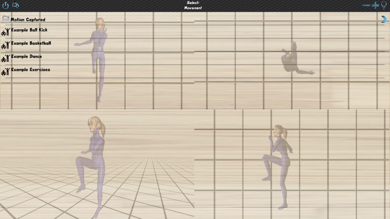 Create and store human body movements in dance, martial arts, sports, or what every else you can dream up, in 3DPlay prerecorded moves from a large inbuilt catalogPlayback movements in 3D from any angle, zoom level, speed, with the option to view a single view or a split screen of four views at once.