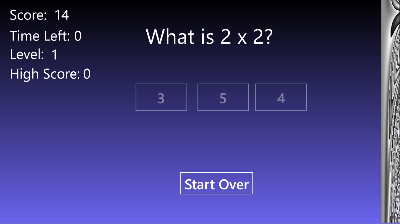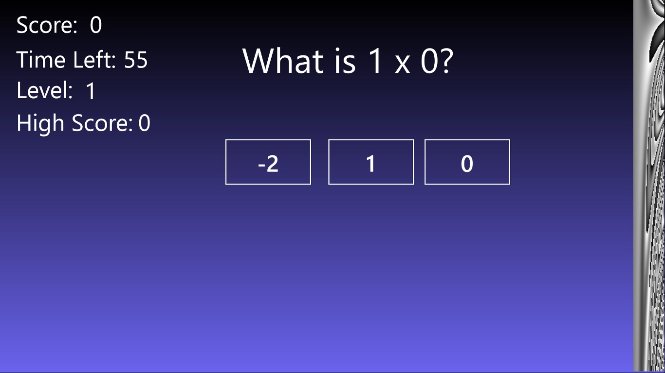 This is a simple multiplication application to help you hone your multiplication skills. You have 60 seconds to answer as many questions as you can per level. For every correct answer, you gain a point. For every 20 questions you answer correctly, you move up a level. If you answer questions incorrectly, you will lose a second. Answer too many questions incorrectly, you will move down a level. This is graduated learning. Practice and get the high score!