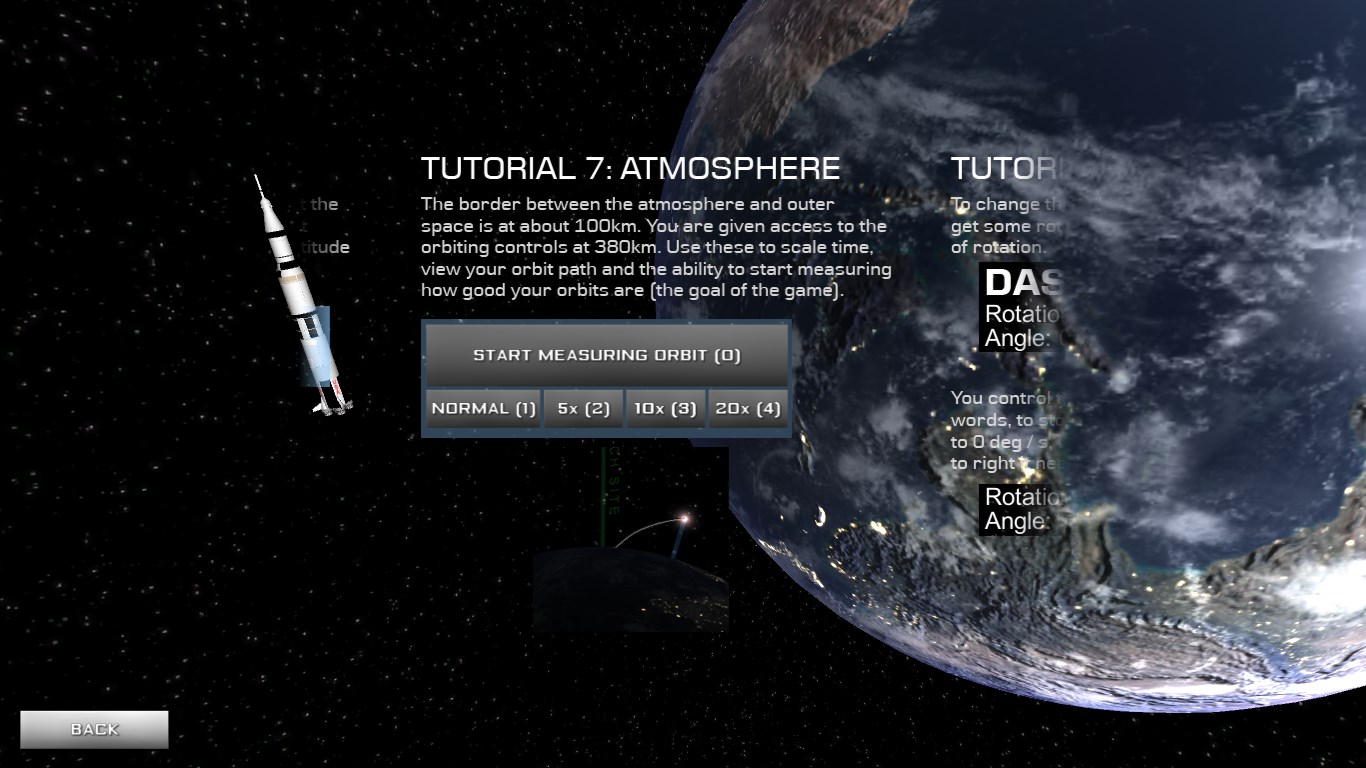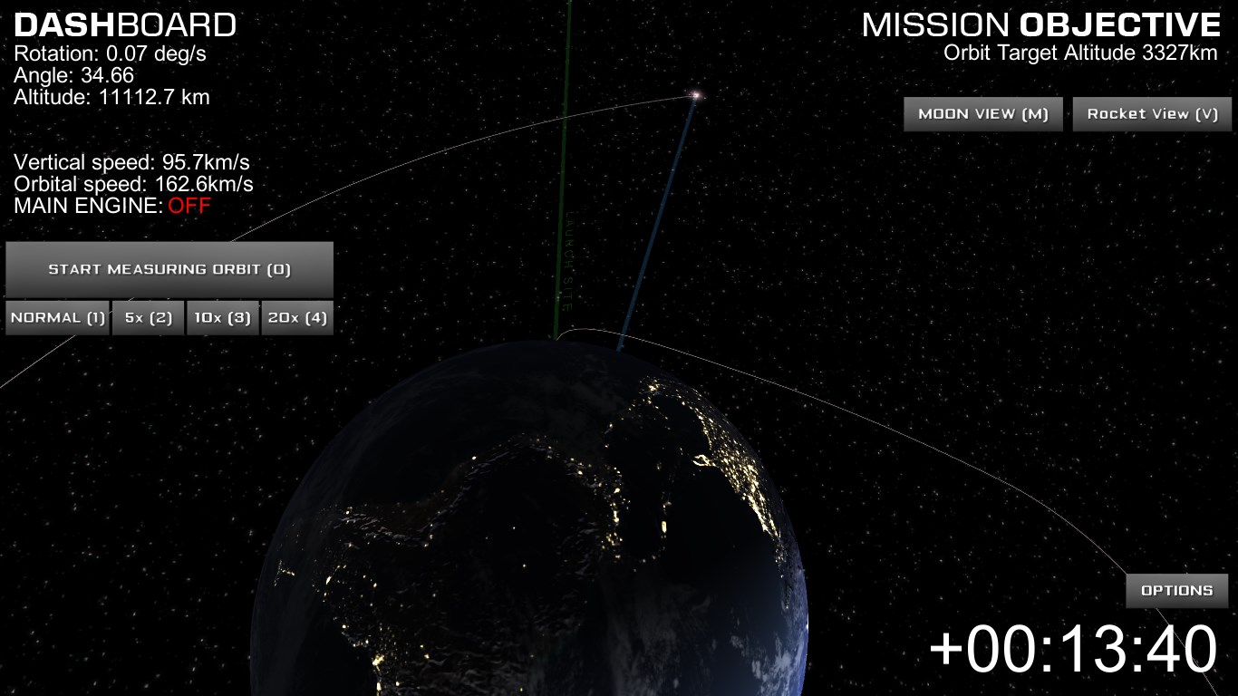 This game is an arcadified simulator where you have to launch a Saturn V (Apollo) rocket into space and orbit around the earth. You are given a random mission every time you start a new game - an orbiting altitude, based on the level of difficulty.