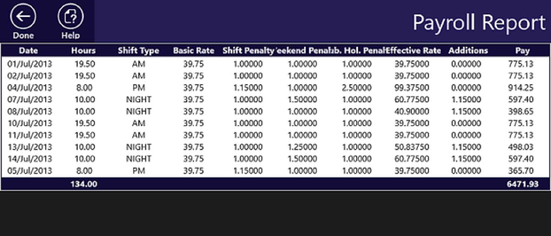 But wait, there's a lot more! Did you ever have trouble checking your pay? Well, you can put your pay periods on the calendar and set up your pay information. Then Working Shifts will calculate your expected pay, taking into account all your bonuses for nights, weekends and public holidays. It will generate a report for any pay period explaining exactly how your pay was calculated. You can share the report too by email.