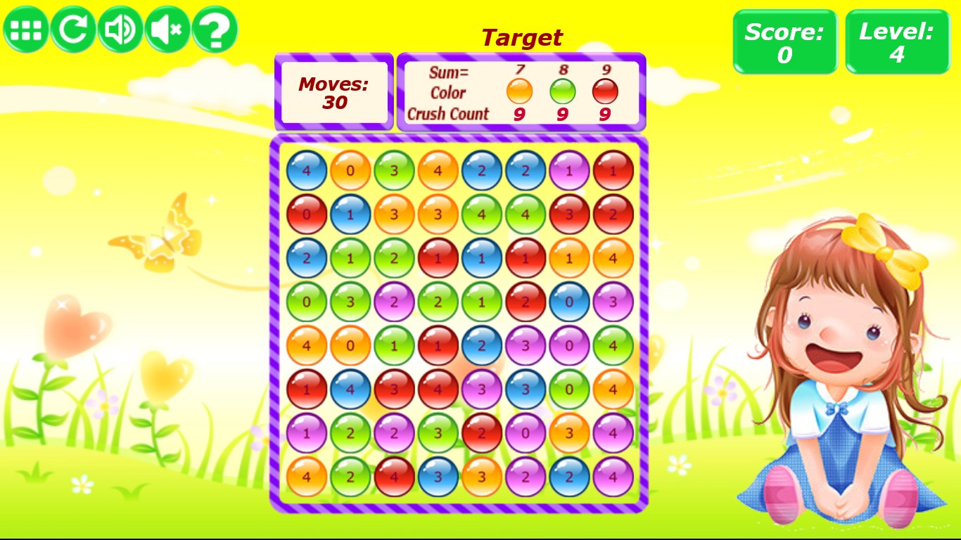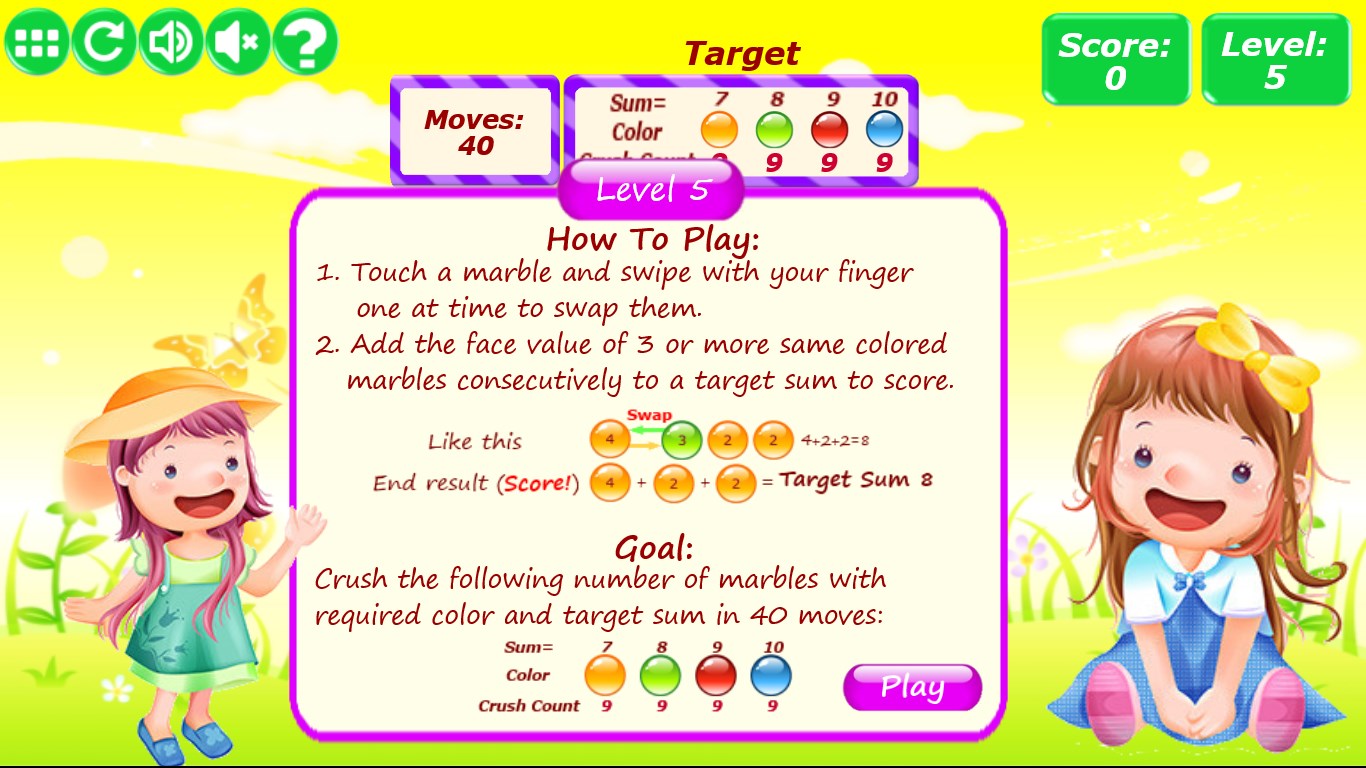 Marble Crush is a simple, entertaining and non-typical match 3 puzzle game that will test your math and logical skills. It is a math version of Candy Crush. Points are scored when you are combining same colored marbles to complete the level's objective. You can earn 1, 2, or 3 stars depending on you your score: the more marbles you use to achieve the level's objective, the more points you get. But be warned: Marble Crush is extremely addictive!