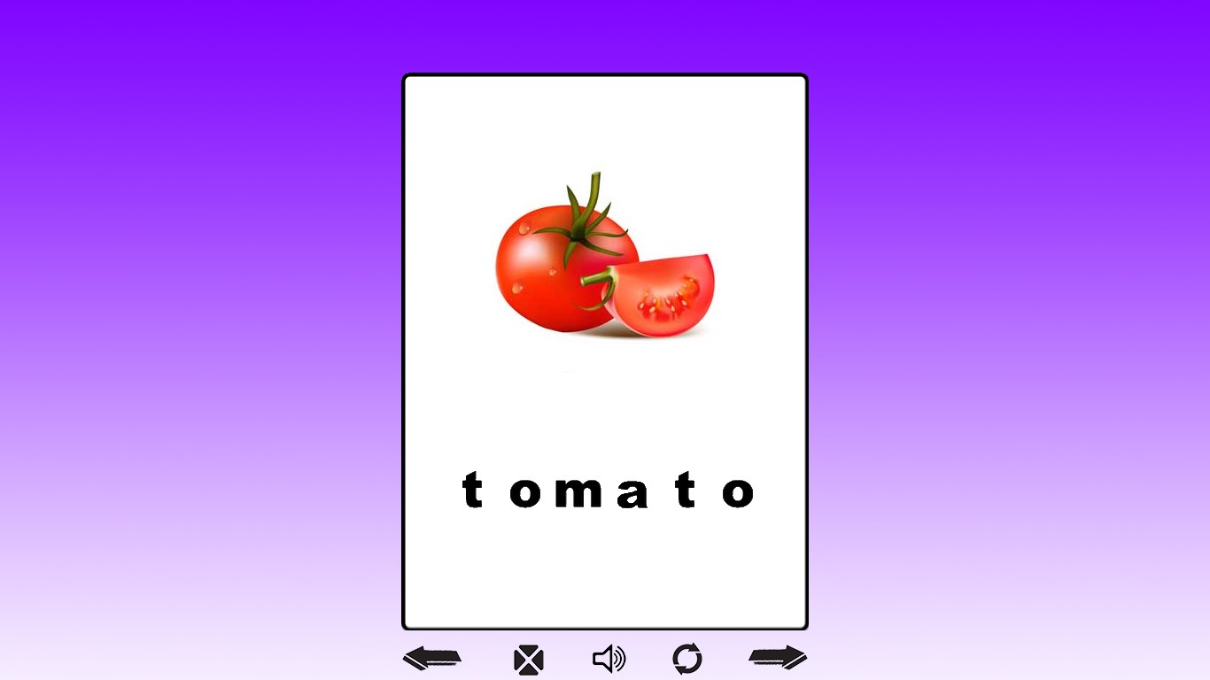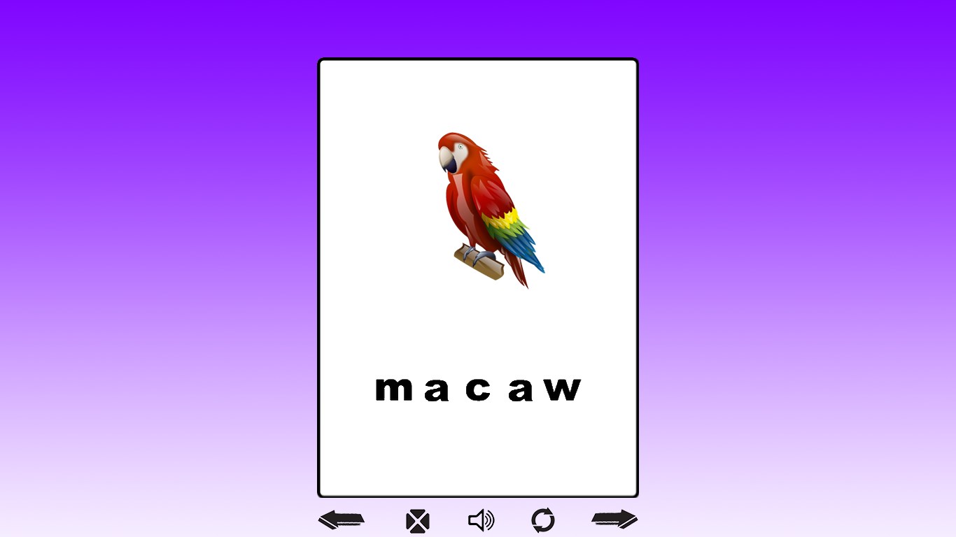 Realistic images, animated cards, sounds250+ unique cardsRepeat animation and soundMute sound for practice, enable sound to verify you are correctNavigation: mouse - click arrows on bottom of the screen or swipe screen to navigate to next or previous cardNavigation: keyboard - use arrow keys to navigate to next or previous cardNavigation: touch - tap arrows on bottom of the screen or swipe screen to navigate to next or previous cardGame: "abc pop"Game: "word it"Game: "abc shake"