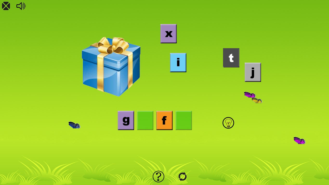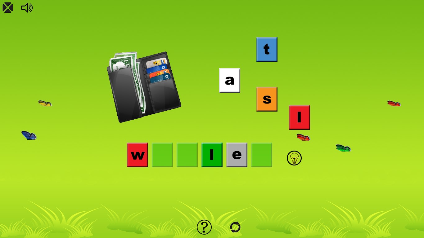 Game: "word it" - write name of object shown on the image, and hear the sound of letters. Click "bulb" to see hint and "question mark" for help.
